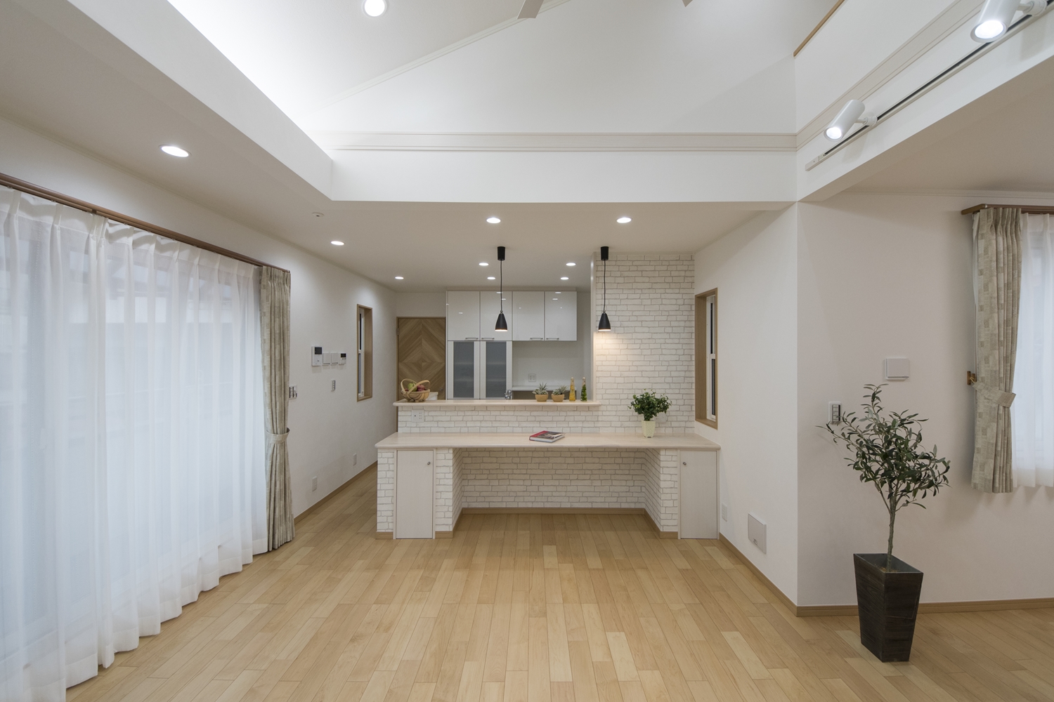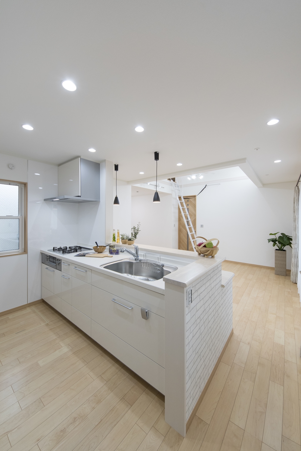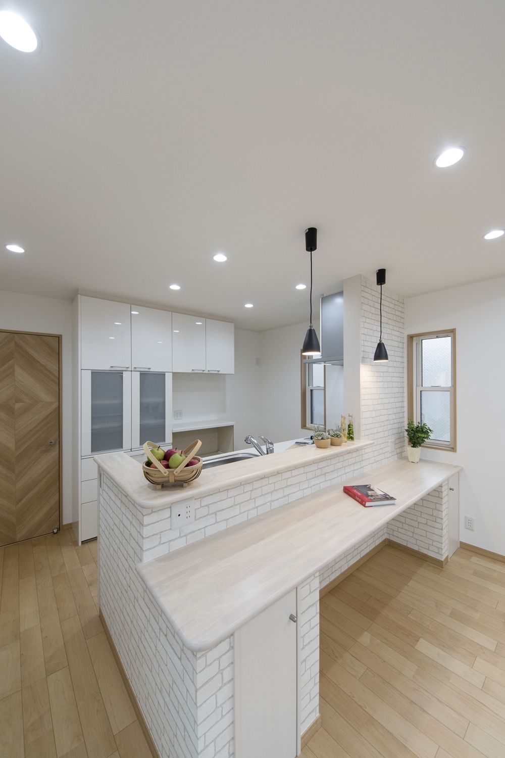 キッチン前に白いレンガ調クロスをあしらったオシャレなカフェ風スタイル。