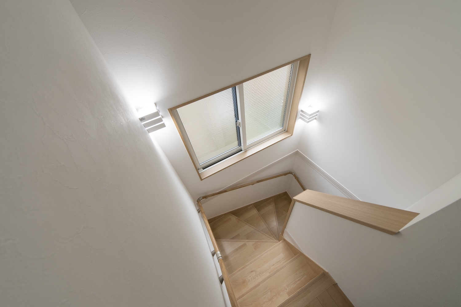 窓からの自然光とブラケットライトのやわらかい光が階段を照らします。