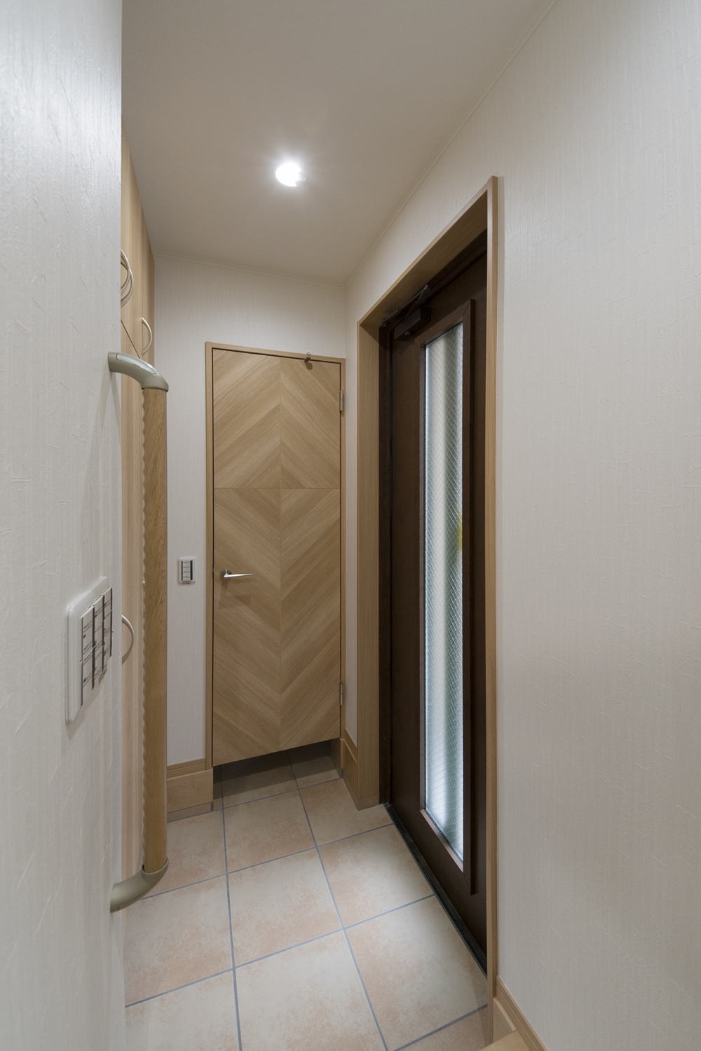1F玄関(子世帯)木の温もり感じる玄関ドアとベージュのテラコッタ調タイルが穏やかな空間を演出。