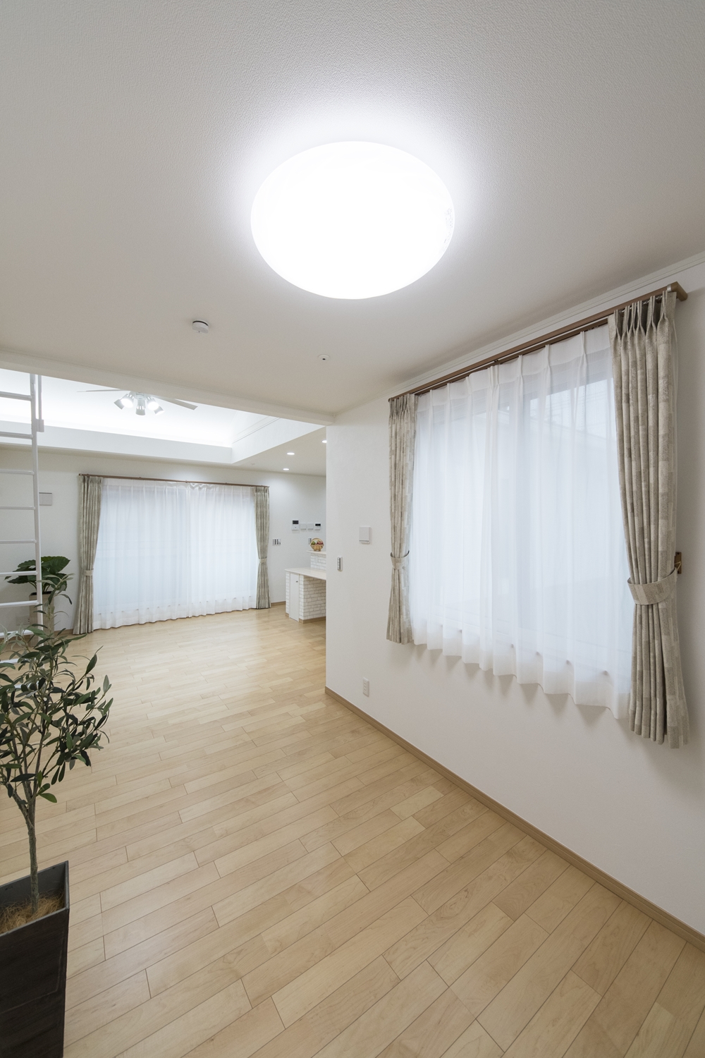 屋根の形に合わせて傾斜を持たせた勾配天井を設え、空間が広がり開放的です。