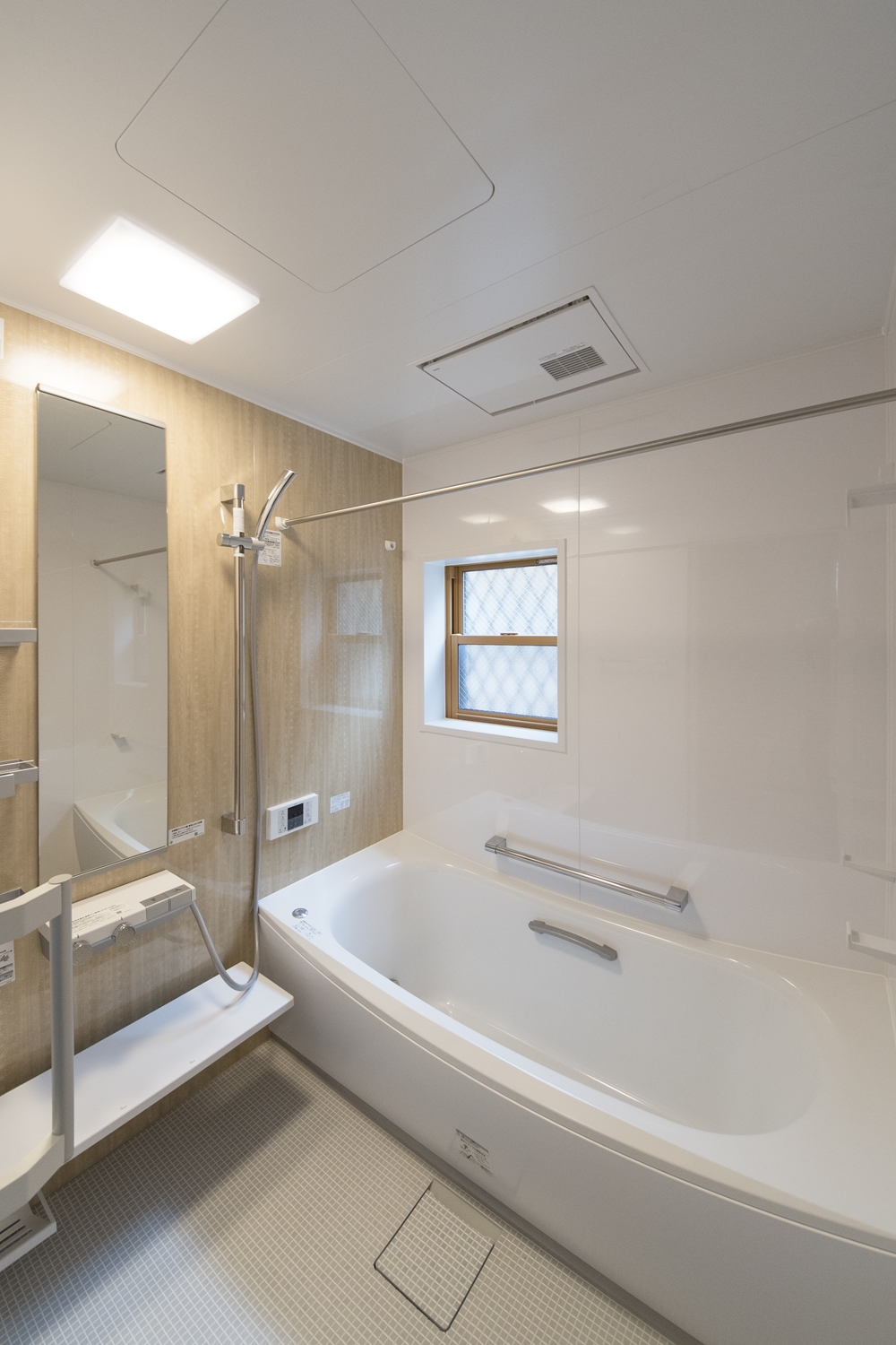 2Fバスルーム(子世帯)/グレーの石目柄アクセントパネルが上質な空間を演出します。