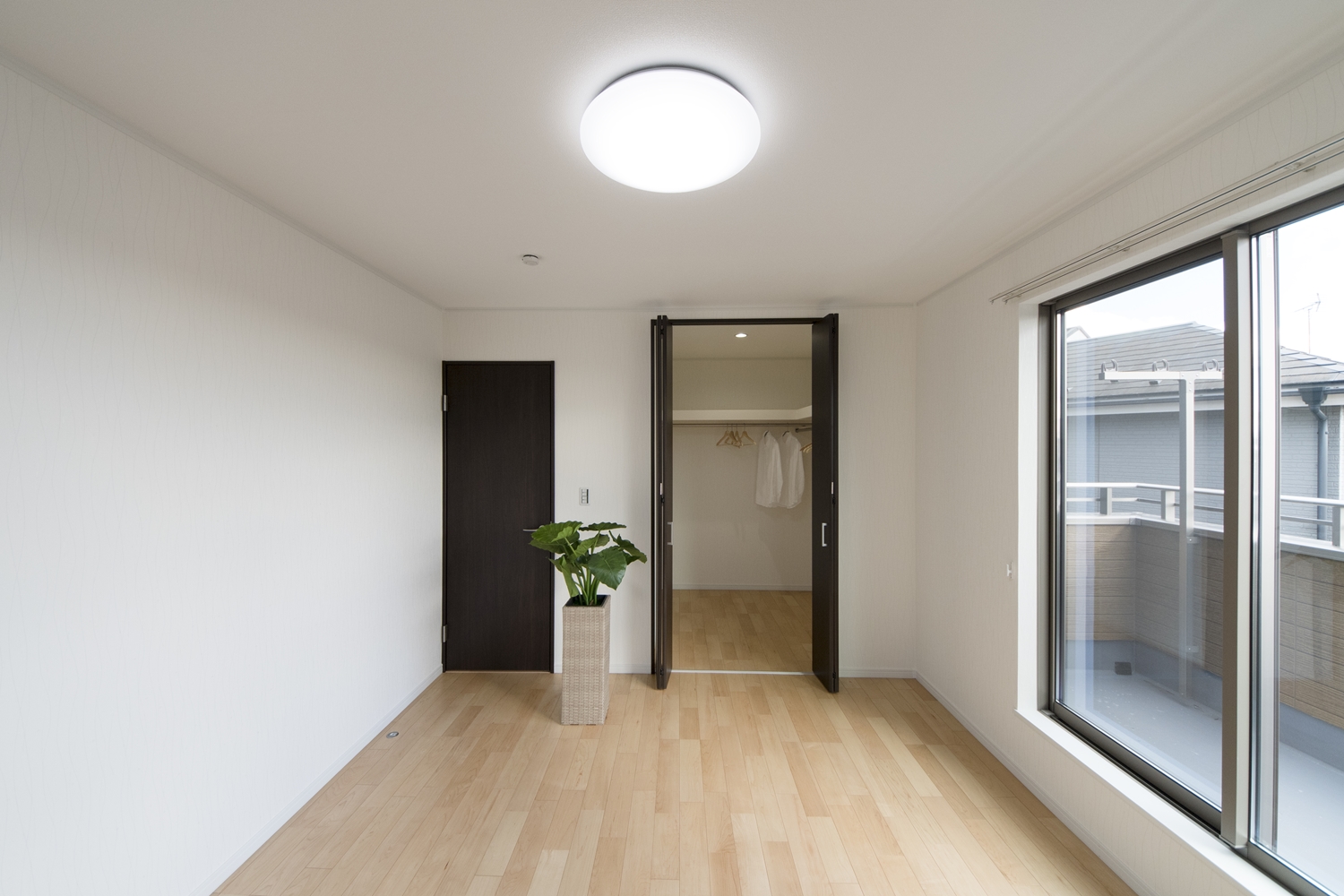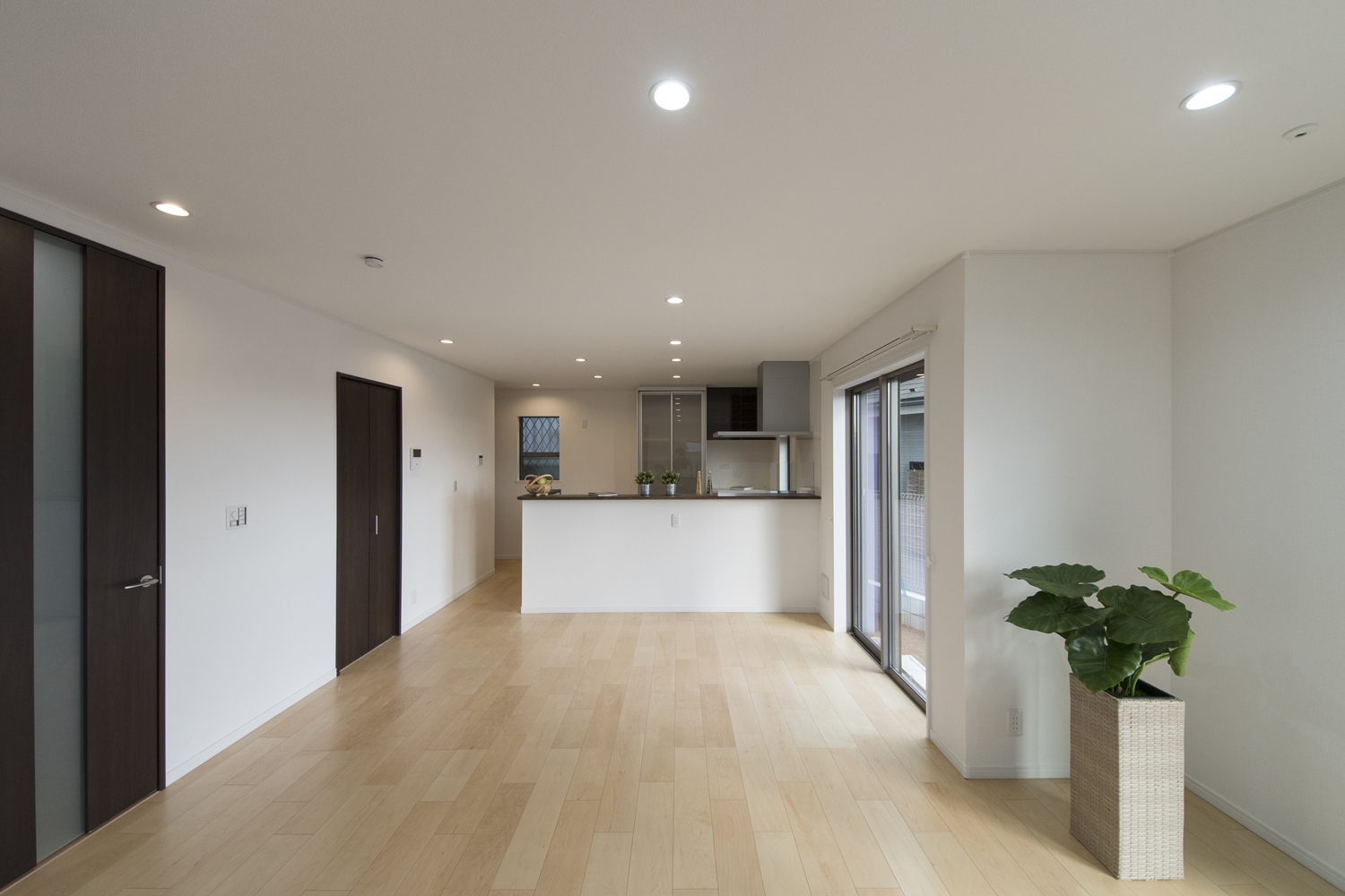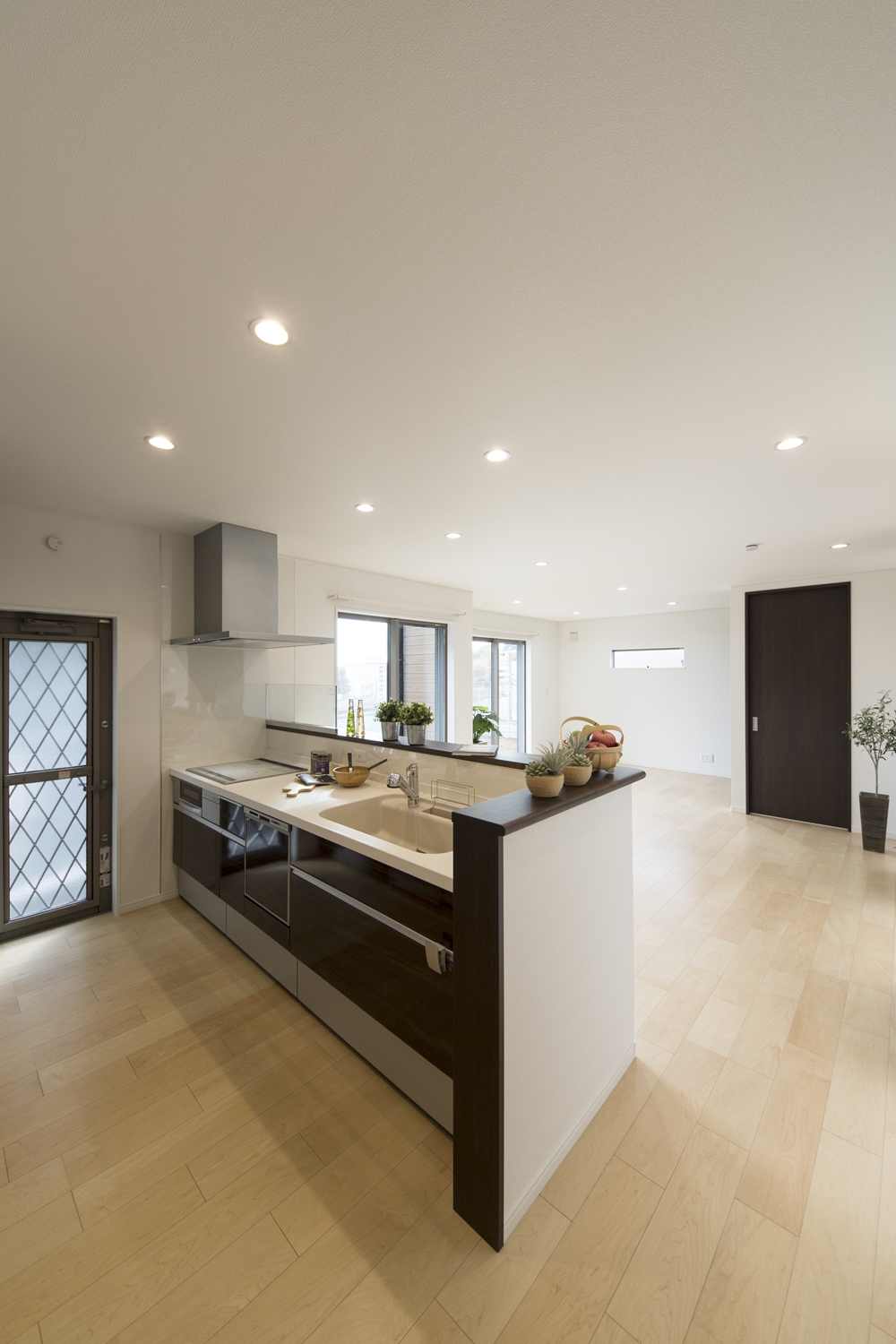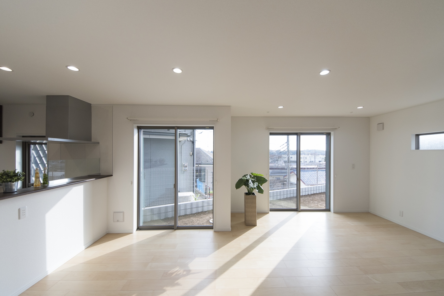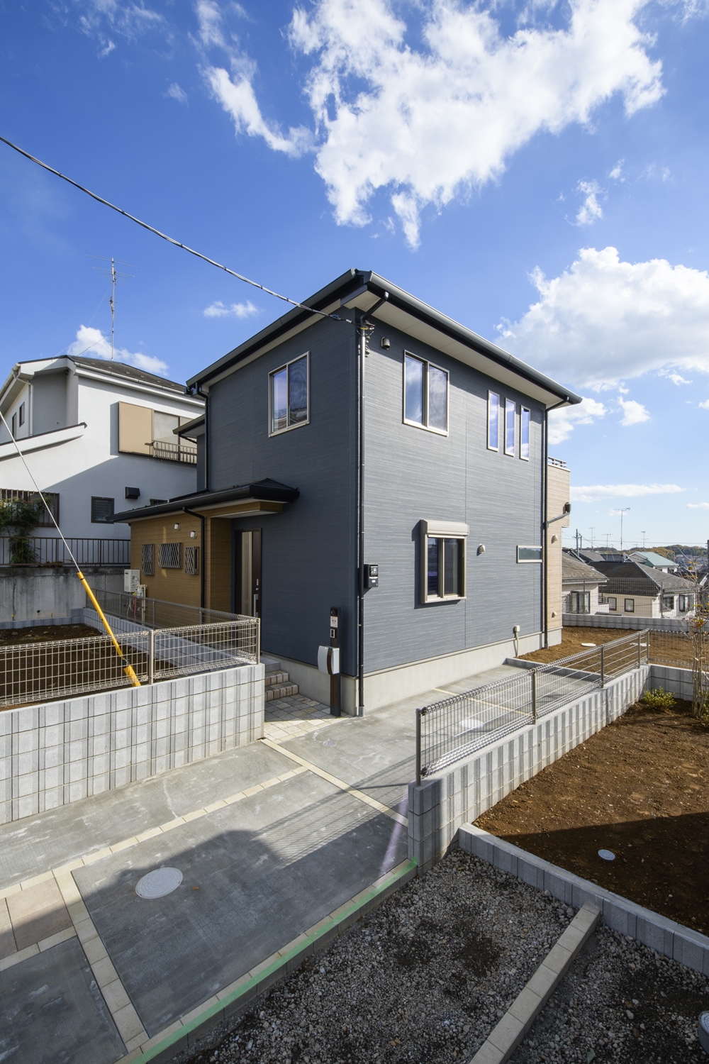 ブルーのサイディングをベースに木目調のブラウンのサイディングをアクセントにした、スタイリッシュ&モダンなデザインの外観。大きな窓を設えたリビングは自然のやさしい光が降り注ぎ、明るく開放的です。