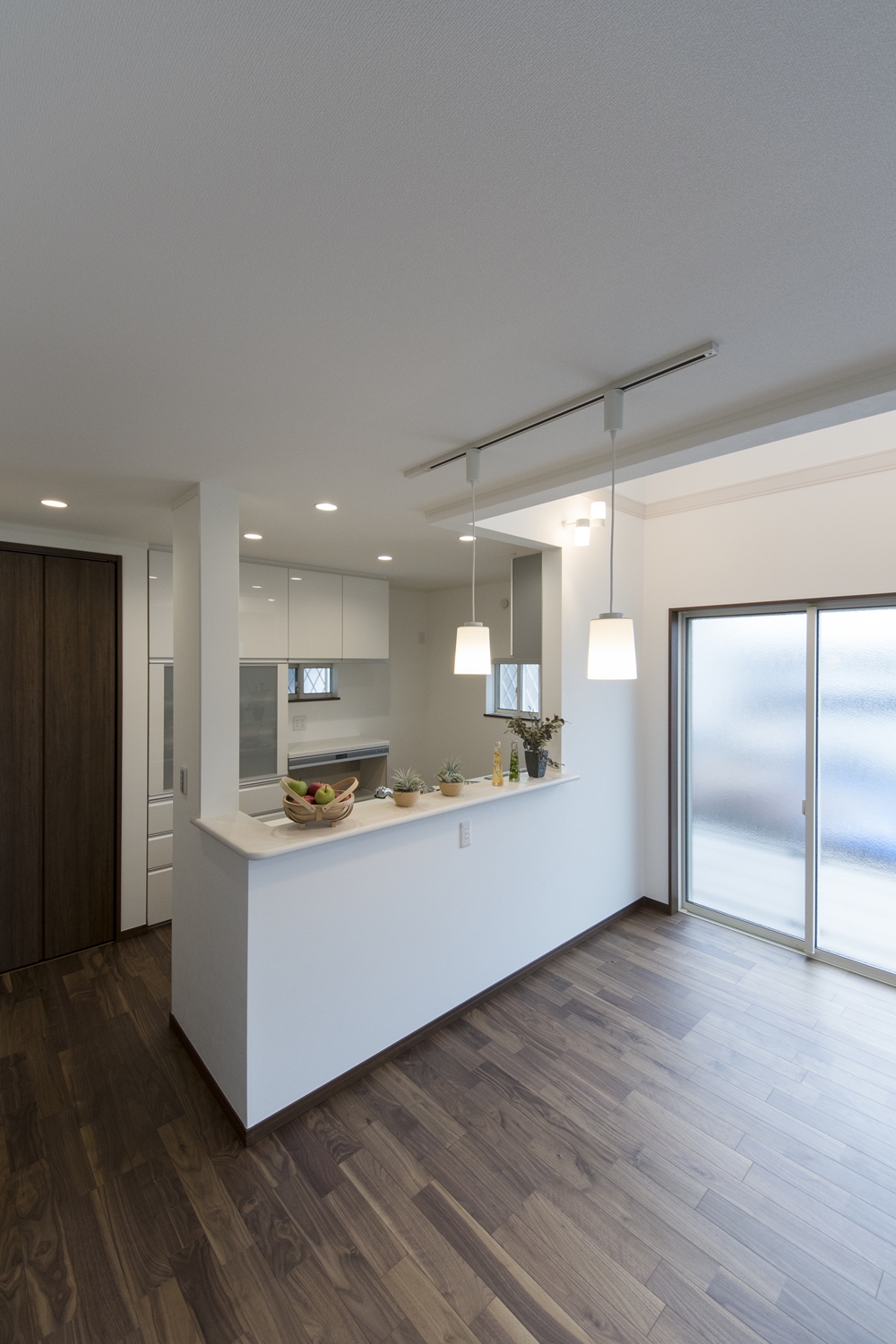 シンプルモダン埼玉県狭山市30坪以上玄関土間、リビングイン階段、ハイスタッド、アイランド/ペニンシュラキッチン