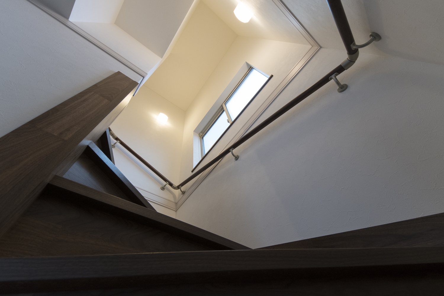 窓からの自然光とブラケットライトのやわらかい光が階段を照らします。