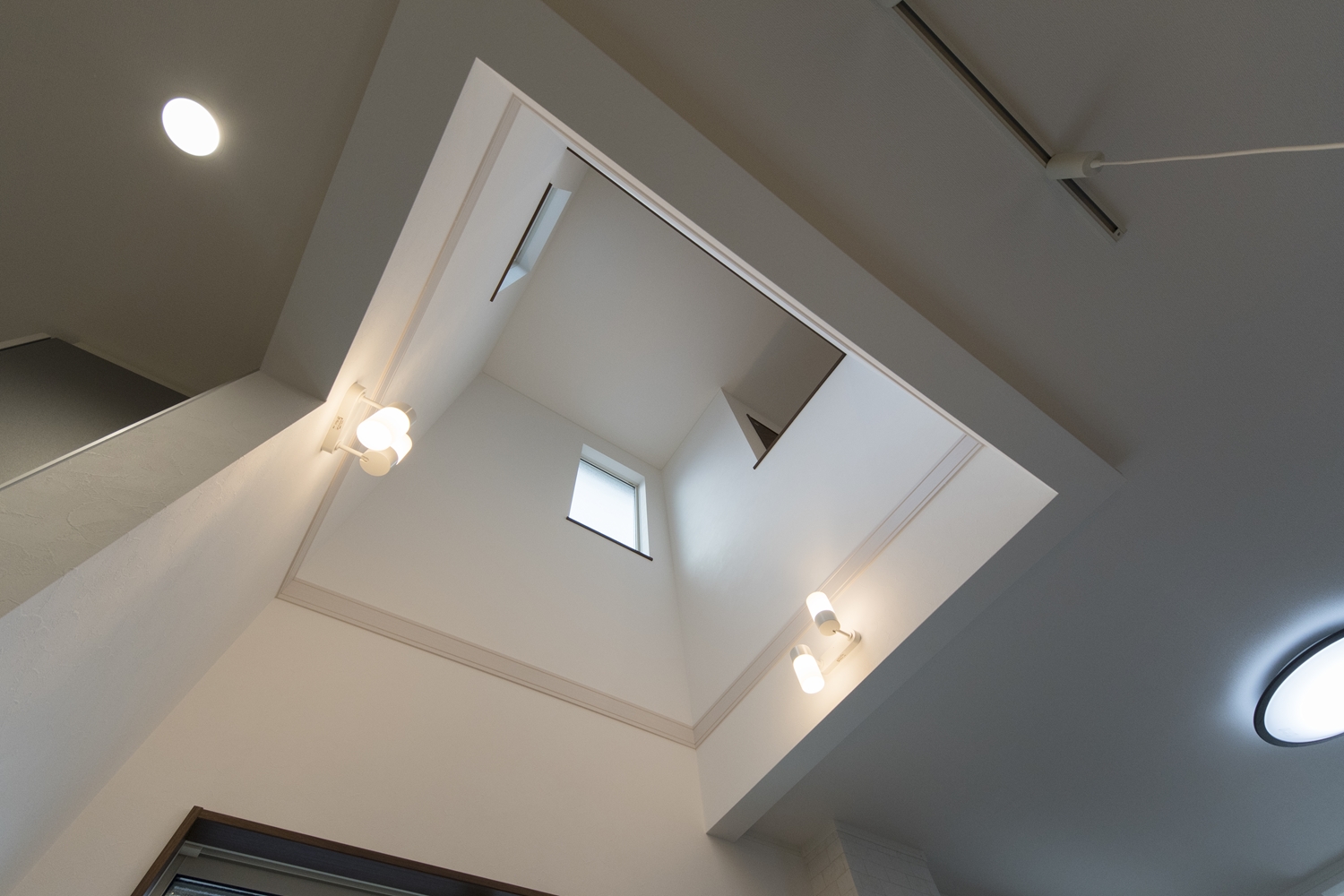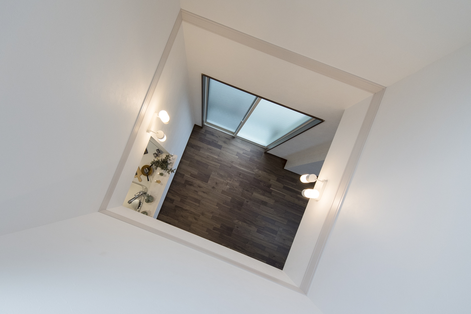 上階からの明るい光が差し込む、光と風が演出する心地よい吹抜け空間。