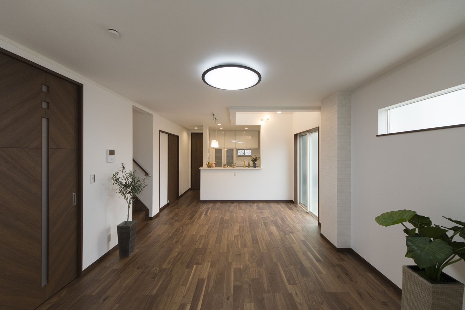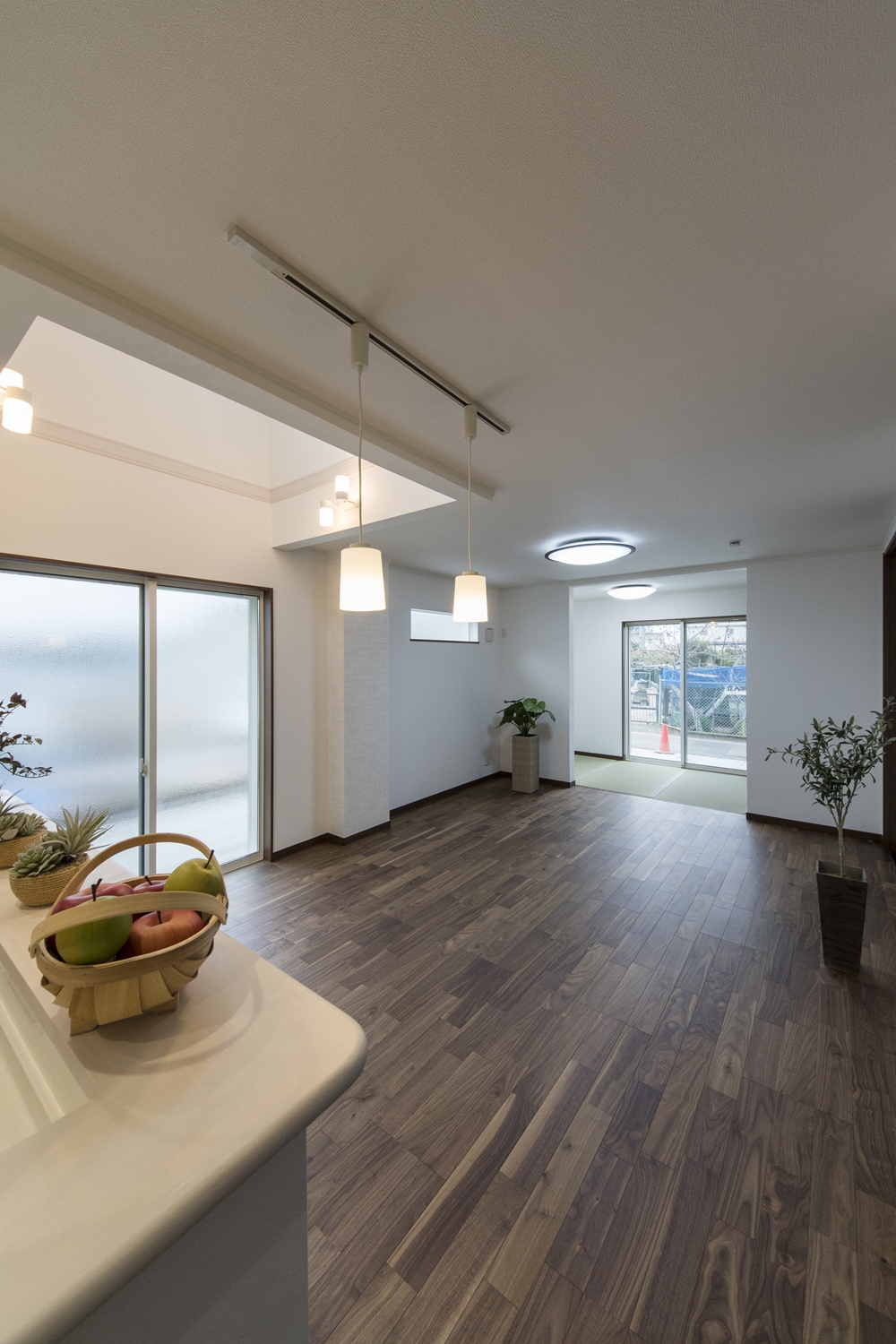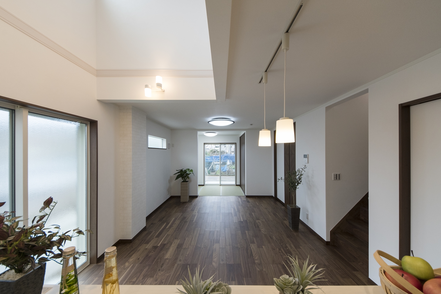 キッチンからリビングダイニングや奥の畳コーナーまで見渡せる、広々と開放的で一体感ある間取りの1階は、上階からの明るい光が差し込む、光と風が演出する心地よい吹抜け空間です。