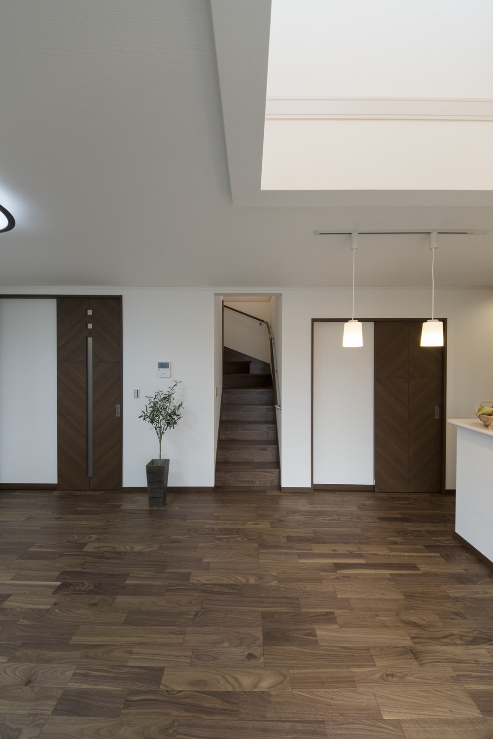 家族の帰宅が分かるリビング階段。みんなが自然と顔を合わせられる家族思いの間取りです。