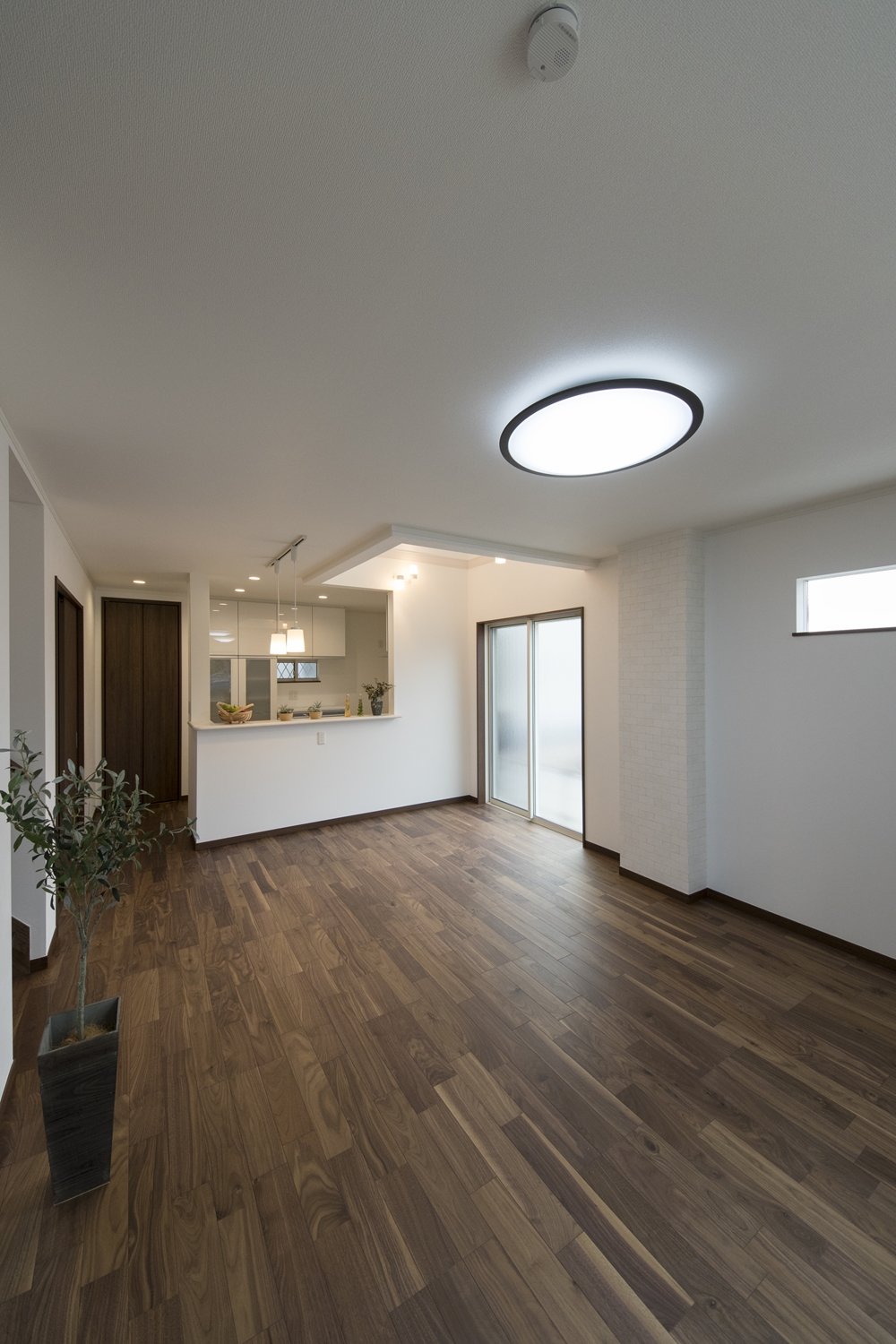 キッチンから、リビングダイニング、奥の畳コーナーまで見渡せる、広々と開放的で一体感のある間取り。