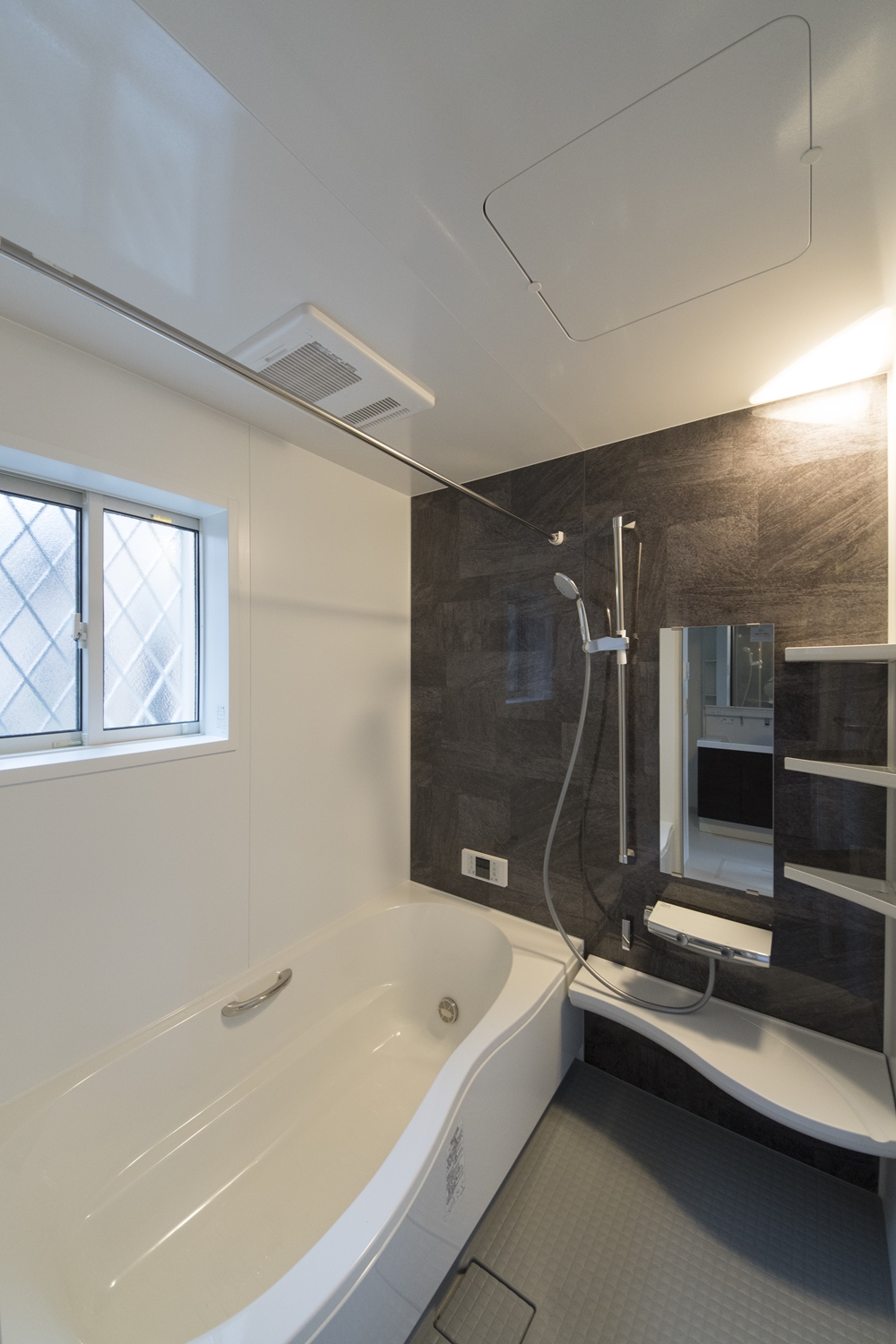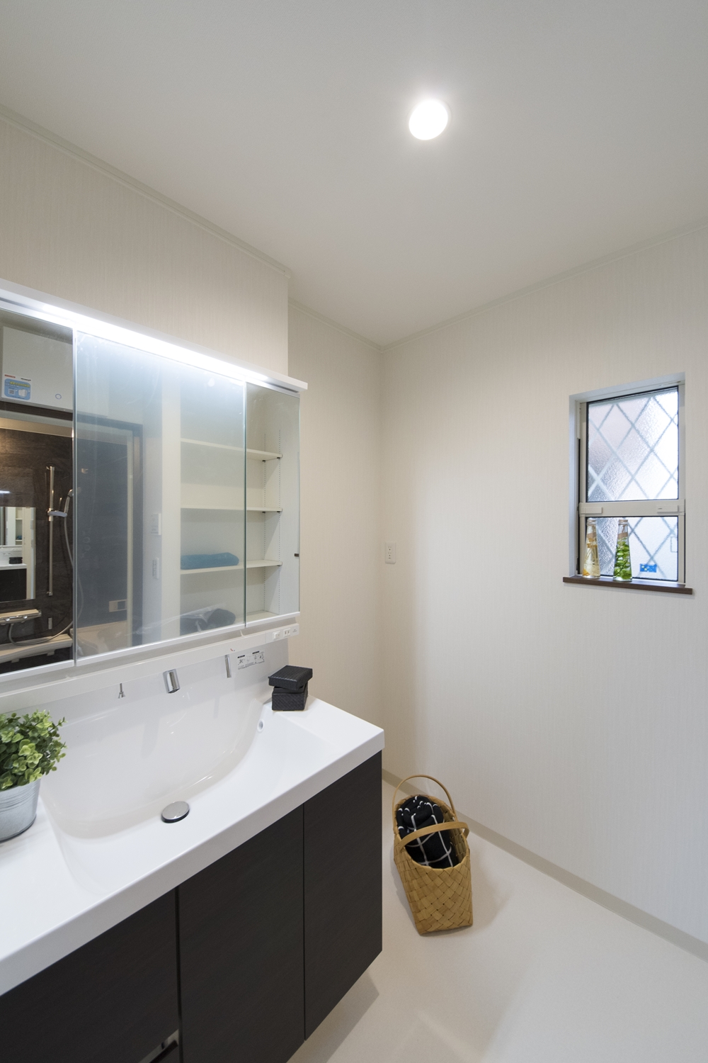 白を基調とした清潔感のあるサニタリールーム。洗面化粧台扉をダークブラウンでアクセント。