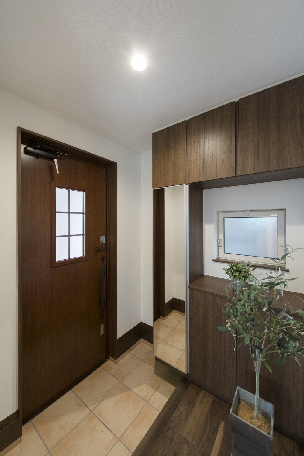 木の温もり感じる木目調のドアと収納、ベージュのテラコッタ調タイルが玄関をナチュラルな雰囲気に包みます。