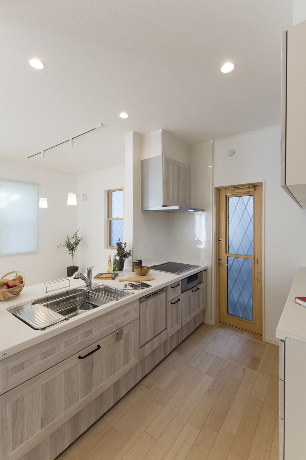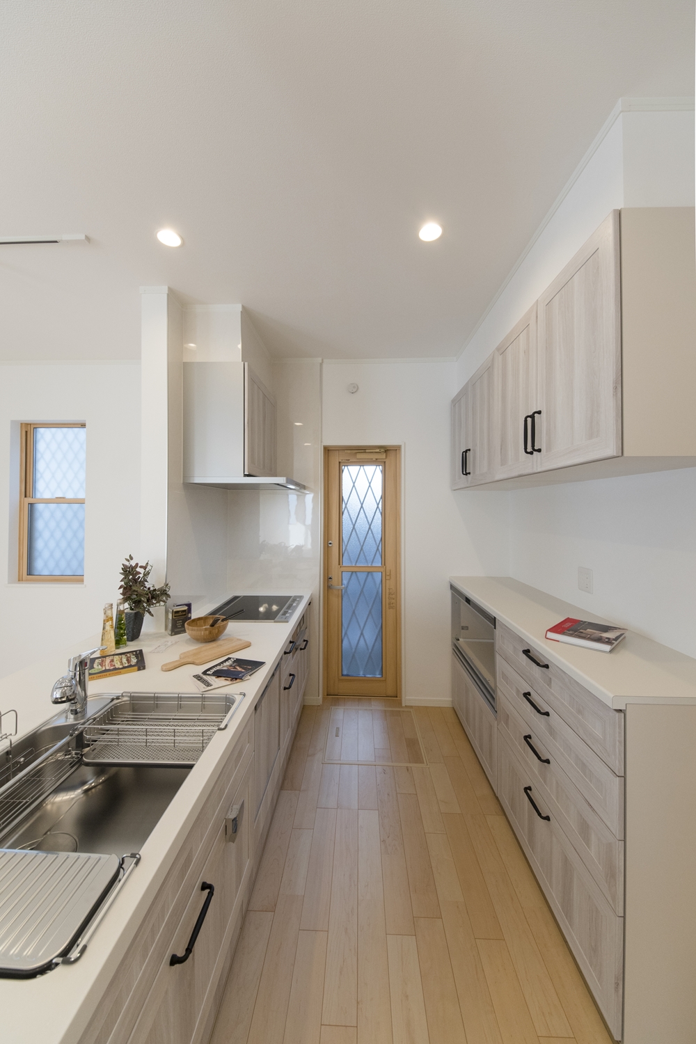食器洗い乾燥機やキッチンとお揃いのデザインのカップボードを施し、機能美も充実させました。
