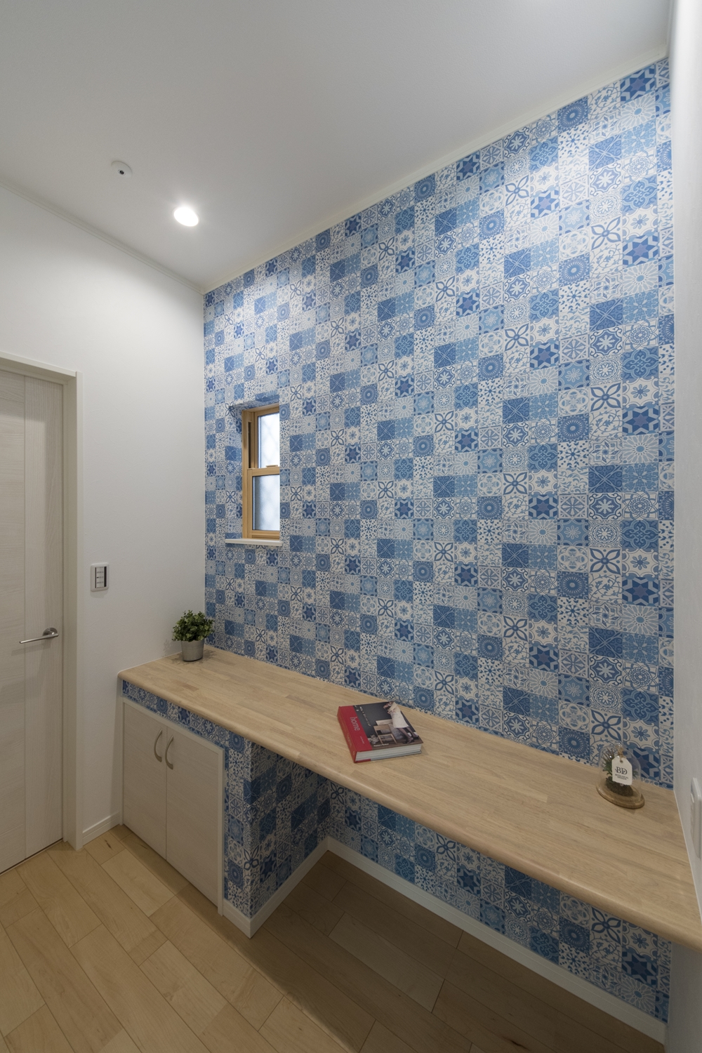 モロッコタイル柄のクロスを貼って、カウンターを設えました。足元には嬉しい扉付収納も♪