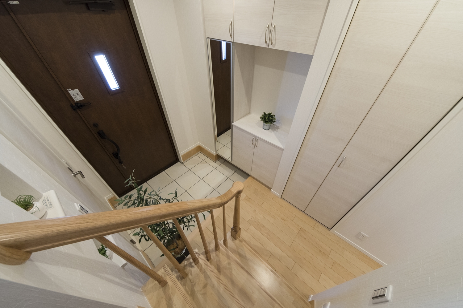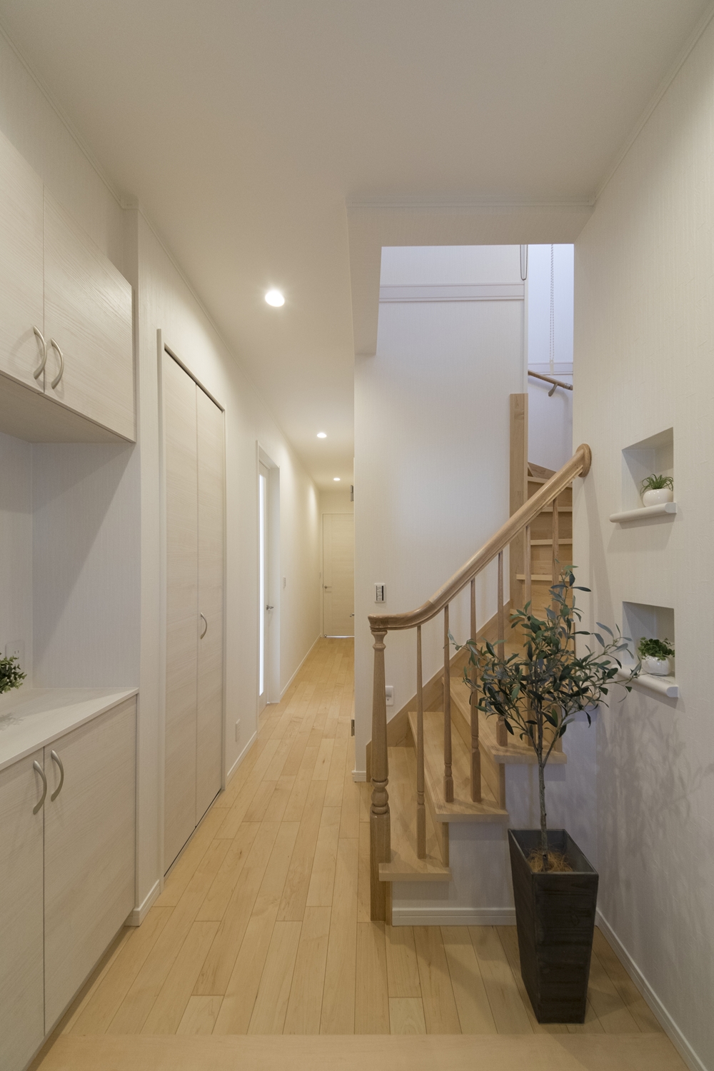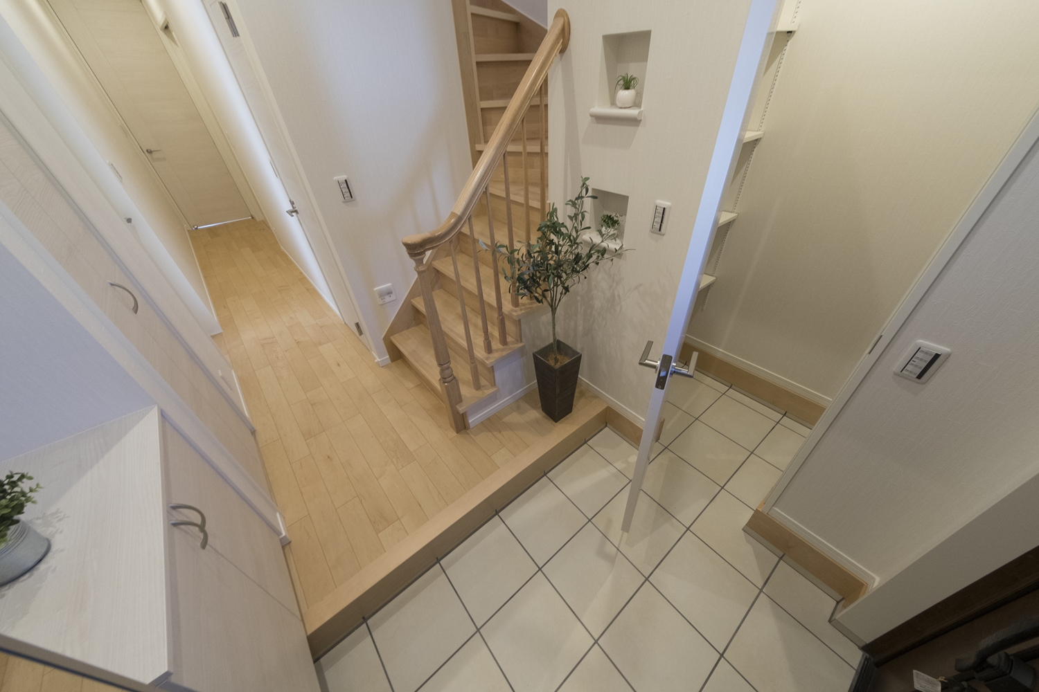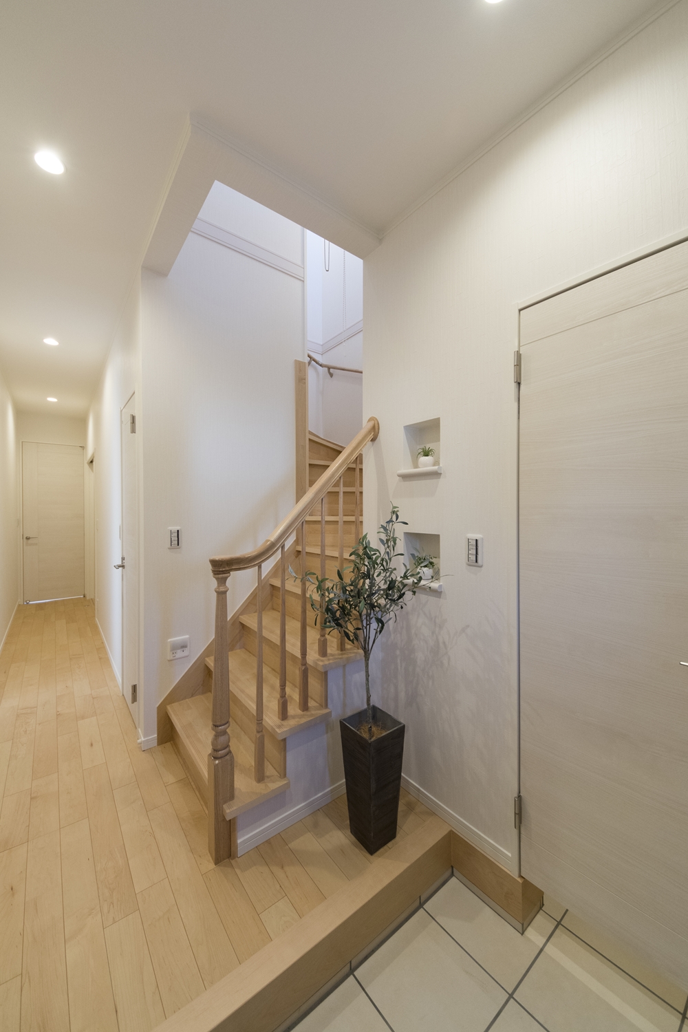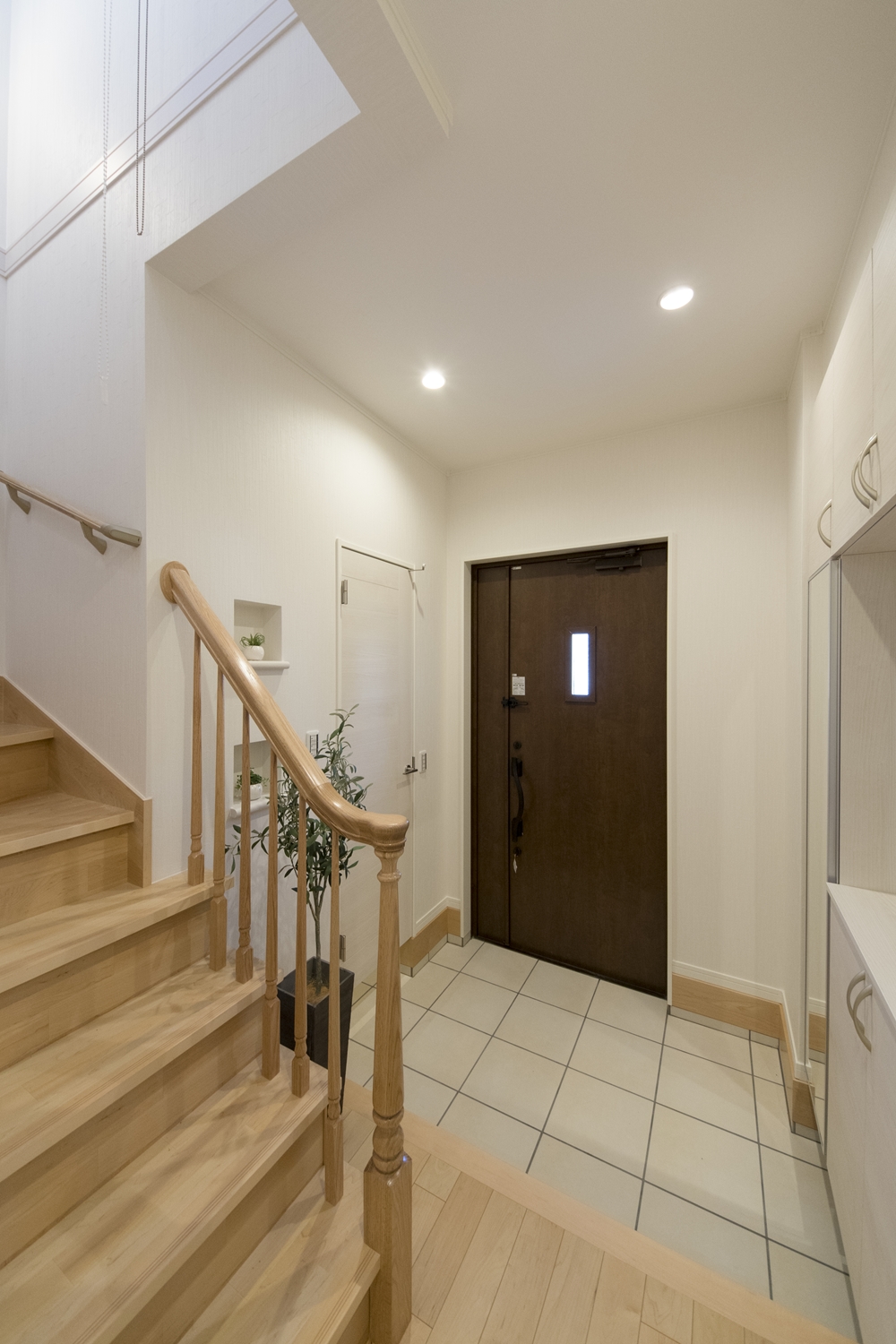 木の質感を感じる温かみのある玄関。ナチュラルさと上品さを併せ持った印象に仕上がりました。