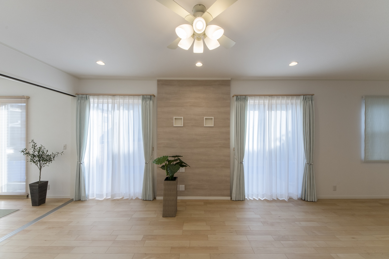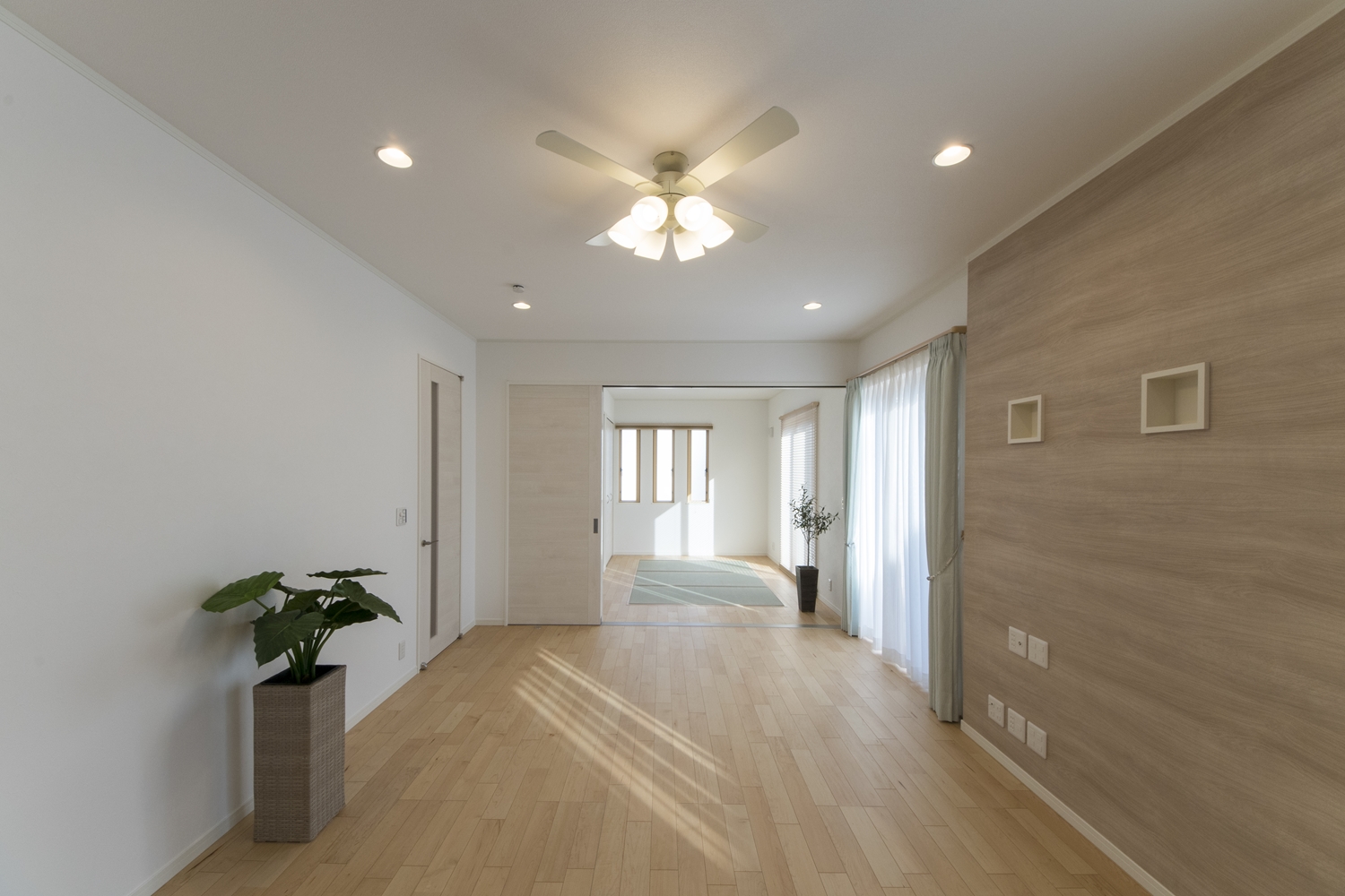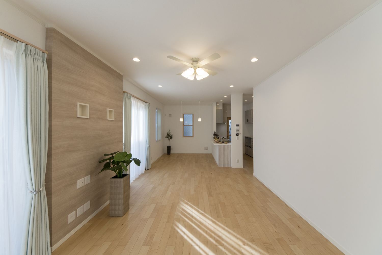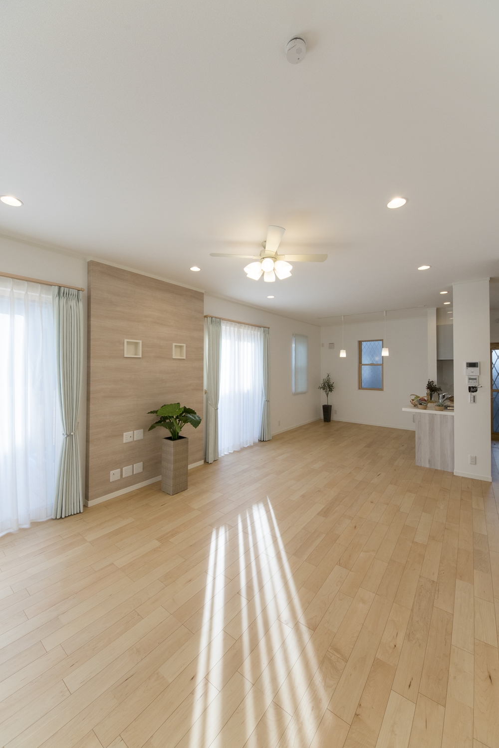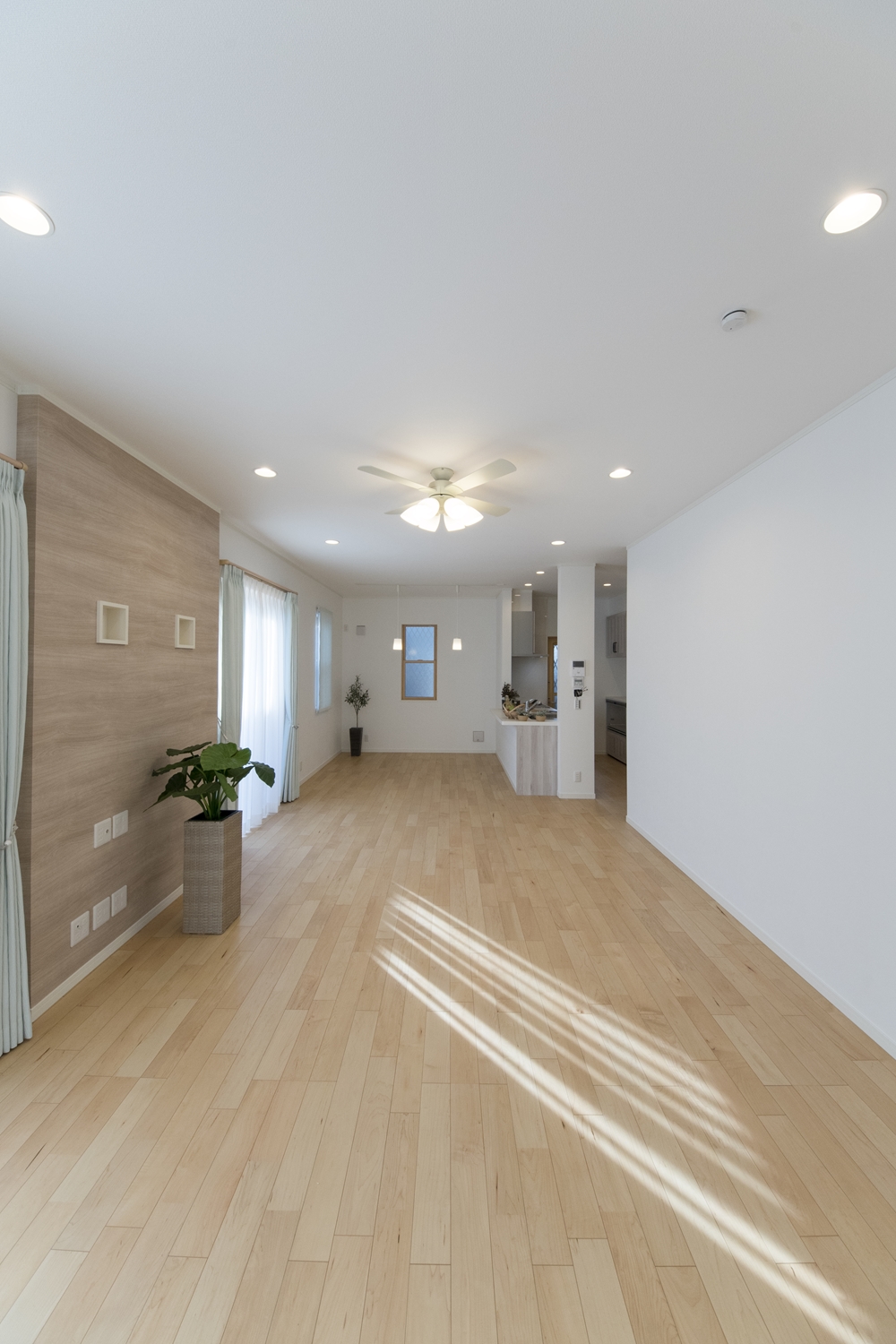 やわらかな木目が印象的なハードメープルのフローリング、ゆったりとした木目調のアクセントクロスを貼ったナチュラルテイストな空間。