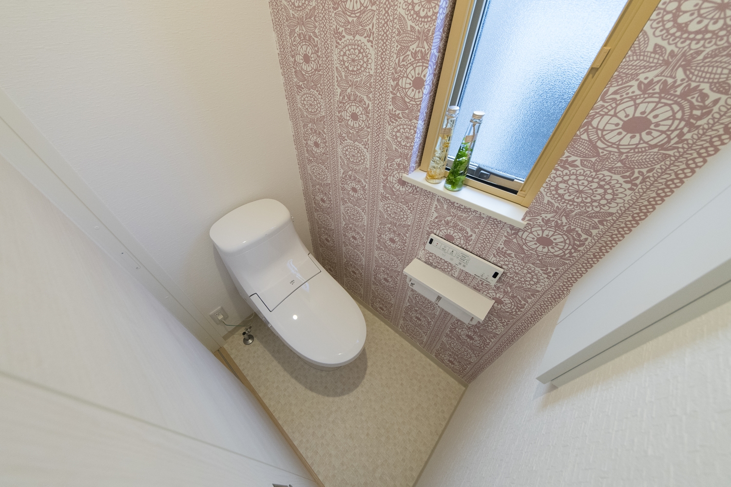 モスピンクのクラシックな花柄クロスが可愛らしい2階トイレ。