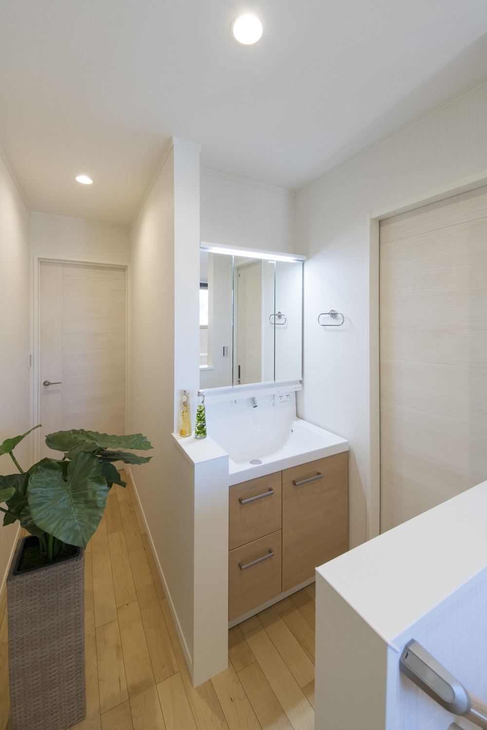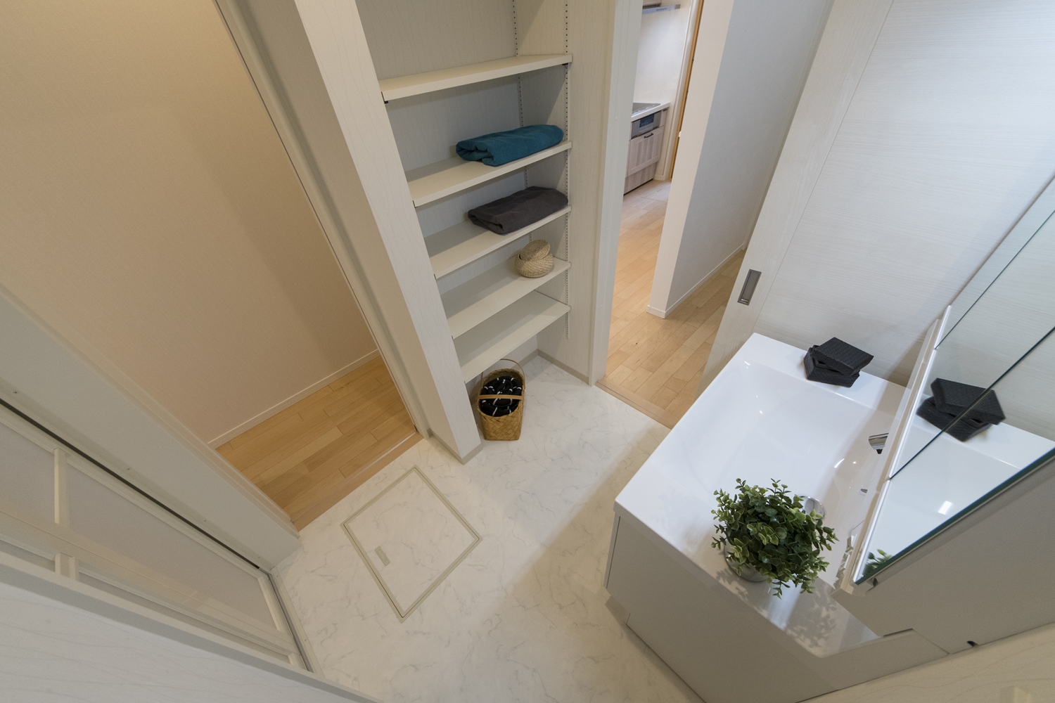 サニタリールーム/廊下からも、家事コーナーからも、キッチンからも出入りできる回遊動線を取入れた間取り。