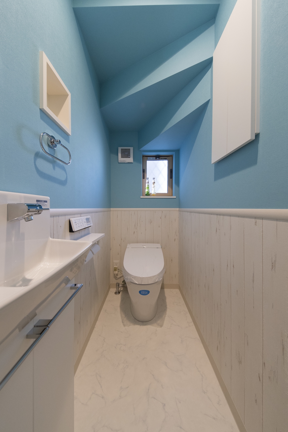 鮮やかな水色と白木調のクロスを上下に張り分けたスタイリッシュな1階トイレ。