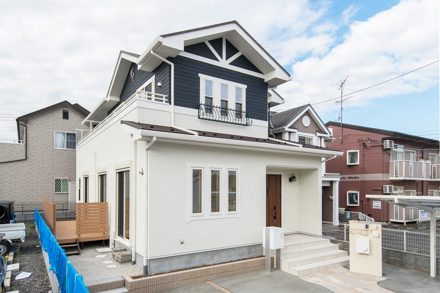 2階の三連窓にエレガントな雰囲気漂うフラワーボックスを施しました。大き目の植木鉢やプランターなどを窓辺で楽しめます。