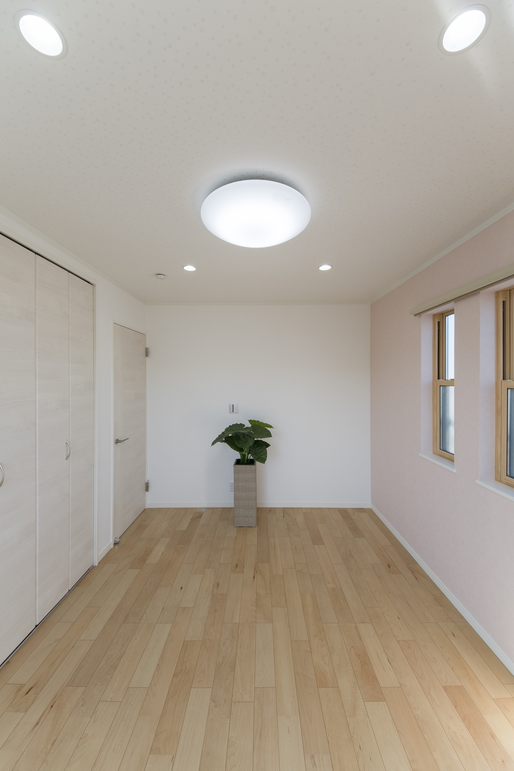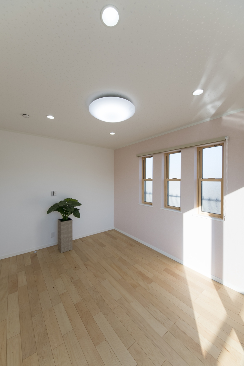 2階洋室/塗り壁調のピンクのクロスをお部屋のアクセントにして、三連の上げ下げ窓を施した可愛らしい空間。