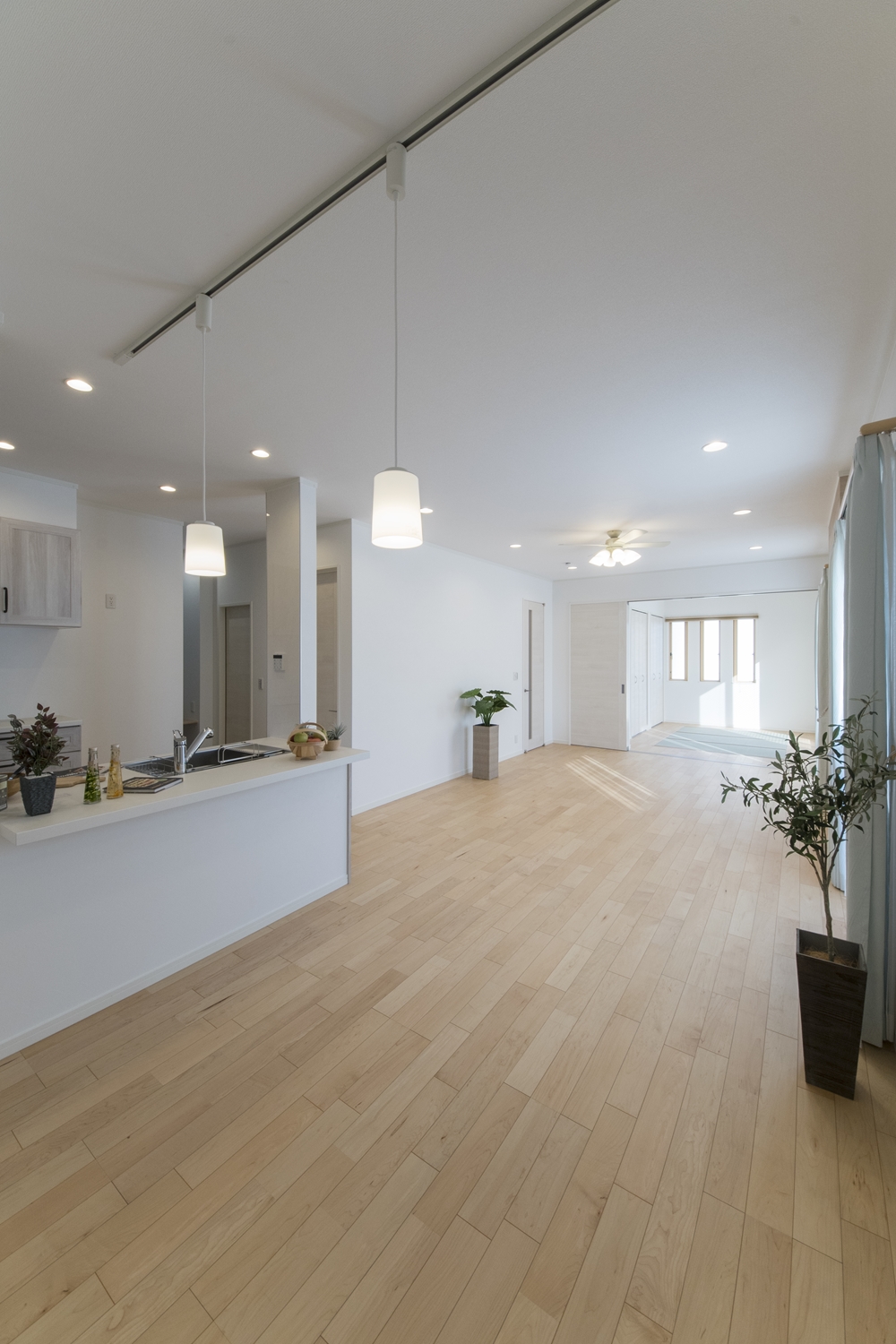 LDKはハイスタッド仕様(CH:2680mm)で天井が高く、21帖の広さ。家族が寛ぐ開放的で広々とした空間。