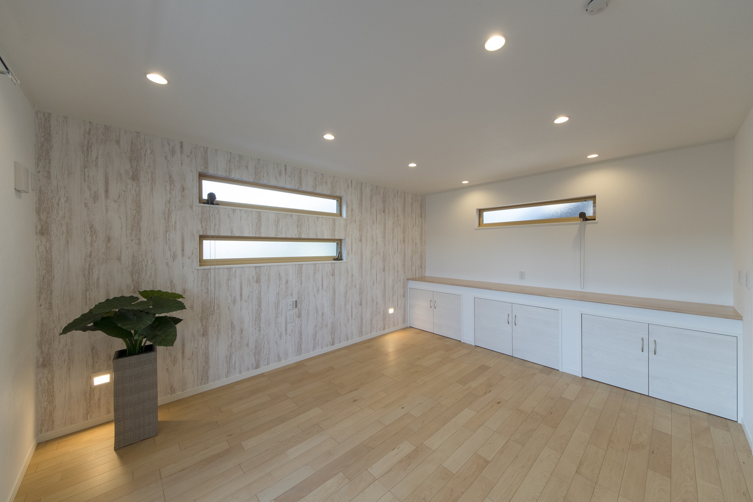 2階洋室/無垢の木に白ペンキを塗ったようなシャビーシックデザインのクロスをアクセントにして、横長の窓を施したおしゃれな空間。