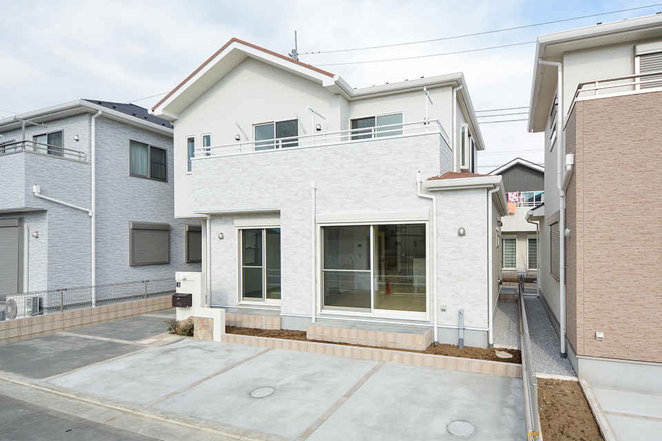 白のサイディングをメインに、白のレンガ調の外壁で表情を持たせ、爽やかで優雅な外観に。