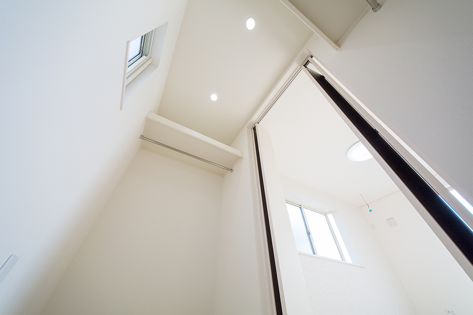 サイドにハンガーパイプを設置。小窓付きで、明るいウォークインクローゼット内部。