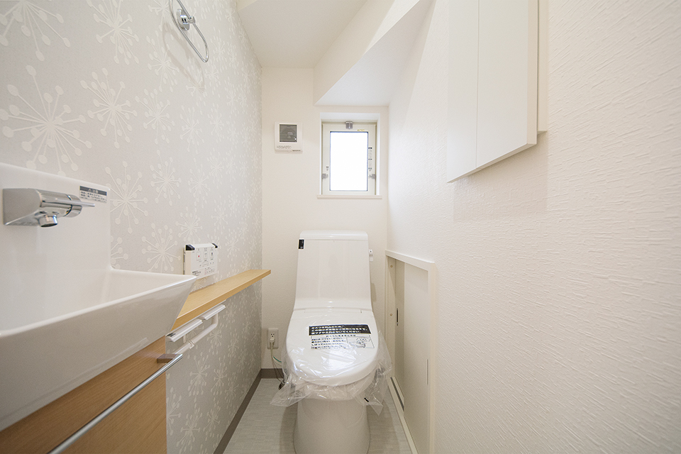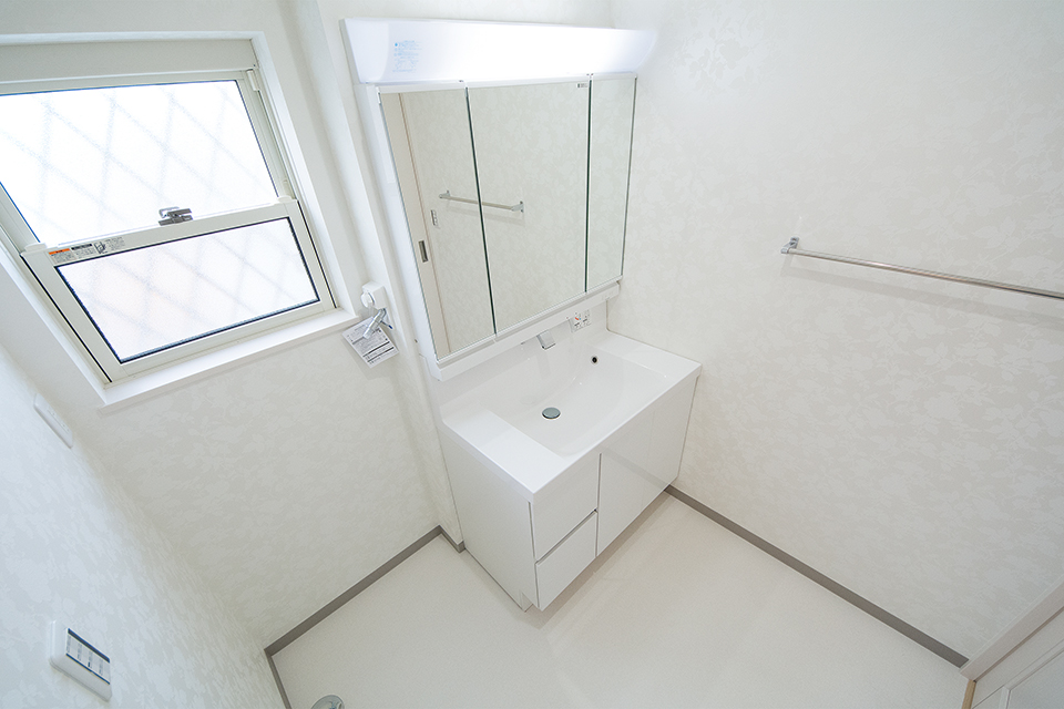 フローラルな花柄の白いクロスが清潔感を演出するサニタリールーム。