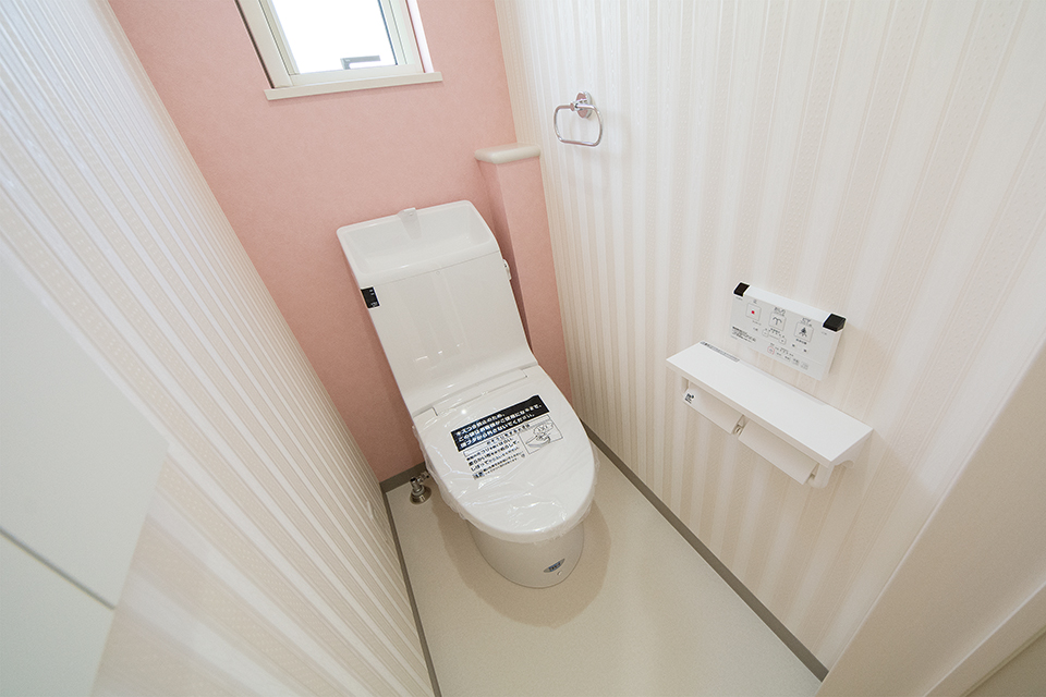ストライプ柄のクロスをメインに、ピンクのクロスでアクセントを加えた可愛らしい雰囲気の2階トイレ。