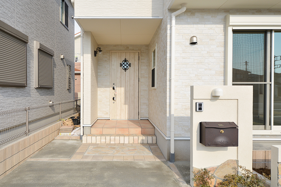木のぬくもりを感じるエクリュアイボリの玄関ドア。アイアンブラックの把手とオレンジのタイルがアクセントとなりエクステリアを彩ります。