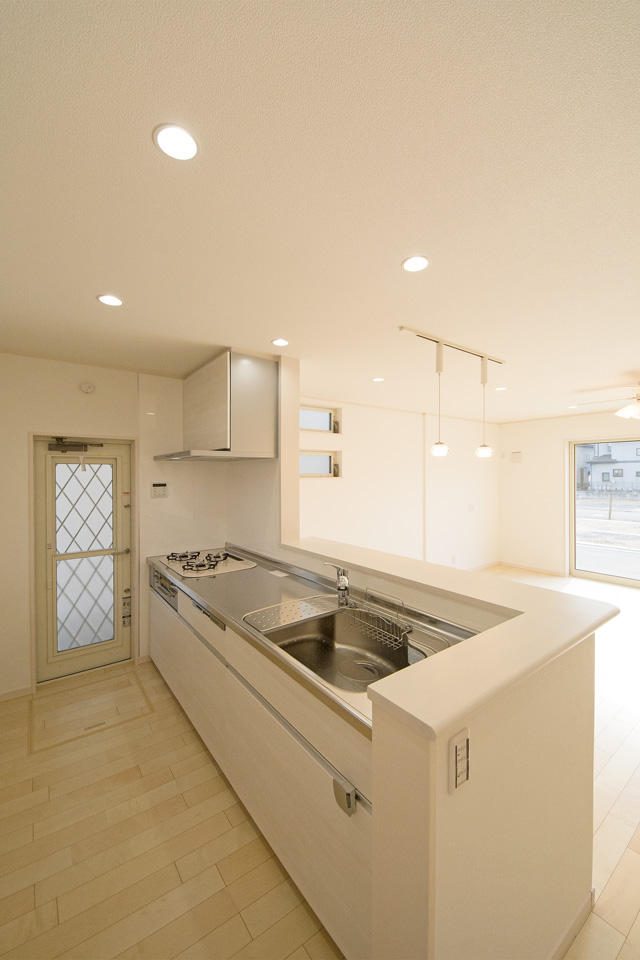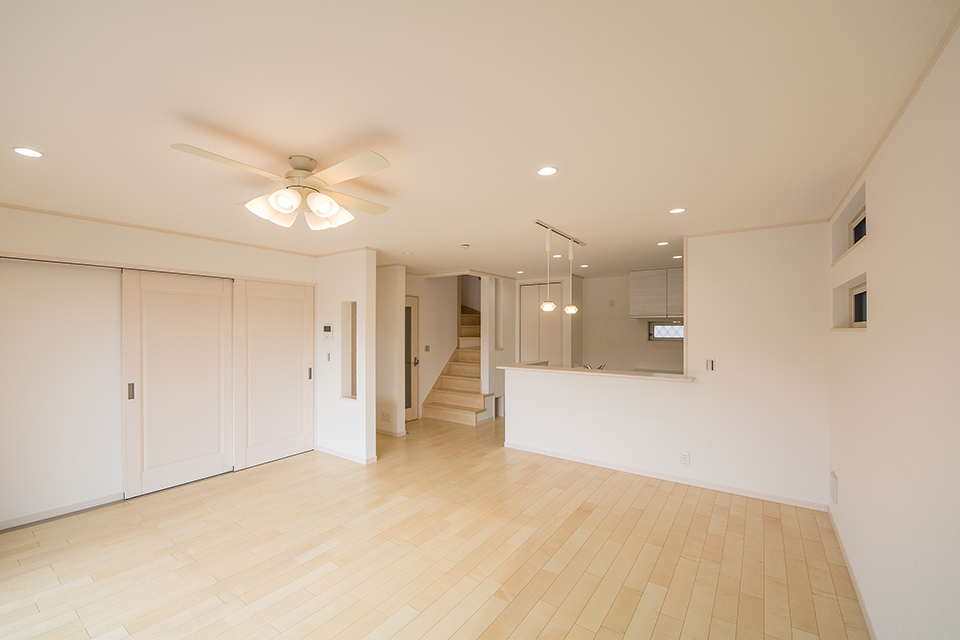 白のサイディングをメインに、白のレンガ調の外壁で表情を持たせ、爽やかで優雅な外観に。 木のやさしい風合いを活かした室内は、穏やかで心地のよい空間に仕上がりました。