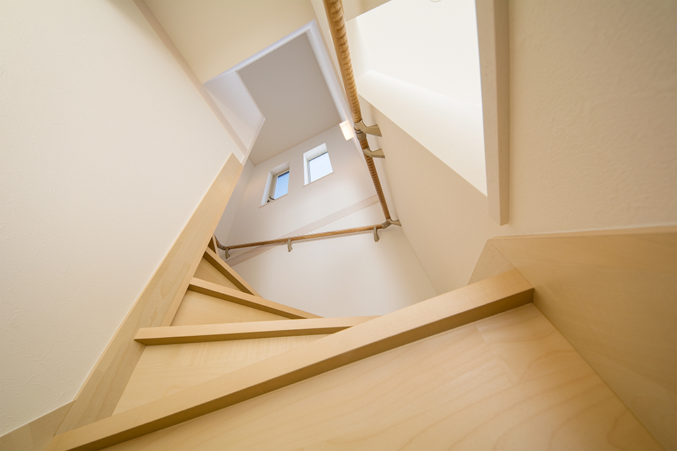 2連縦すべり出し窓を設置し、通風も採光も良く開放感ある階段に。