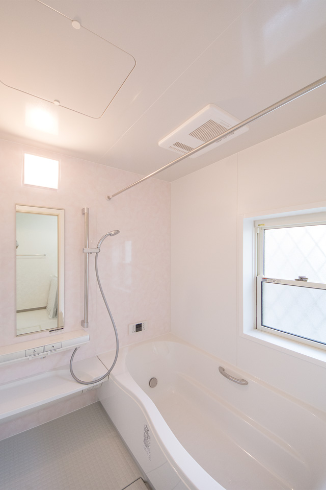 ライトピンクのアクセントパネルがさわやかなバスルームを演出。