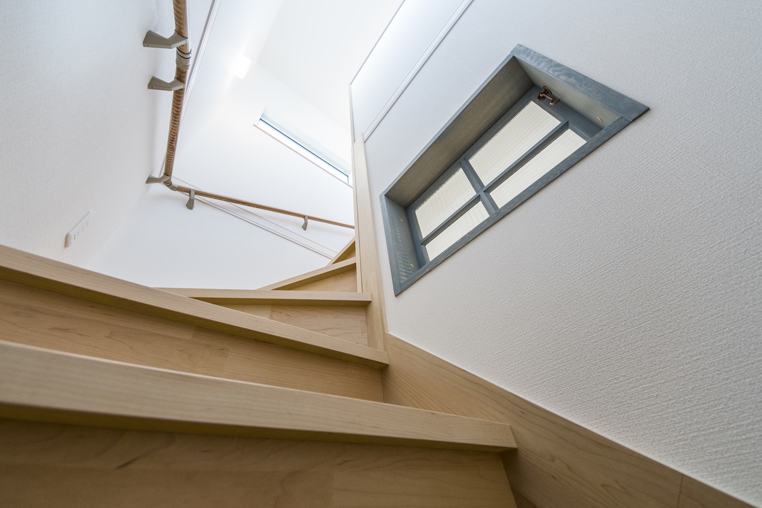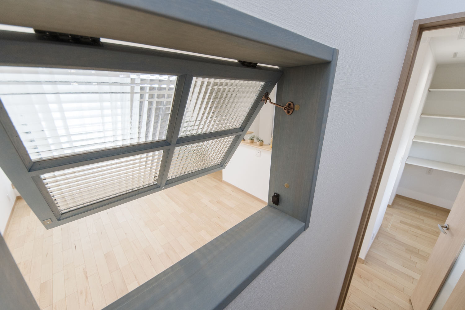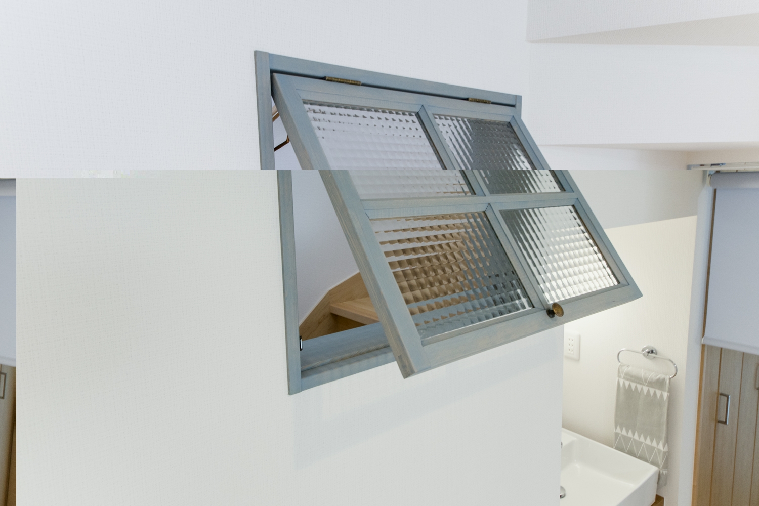 リビングと階段の間にインテリアとしても楽しめる、カフェ風の室内窓を施しました。
