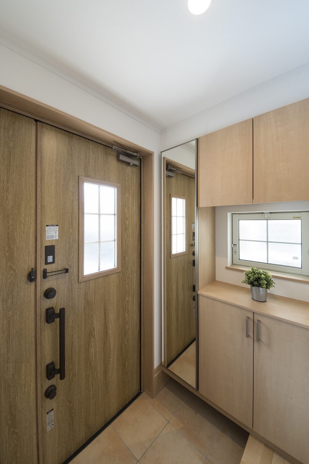 木の温もり感じるナチュラルテイストな玄関。ドアのガラス部分や小窓からたっぷりと光が差し込む明るい空間。
