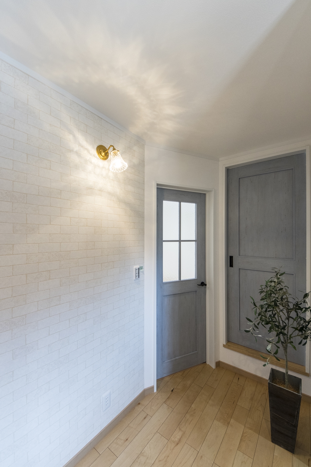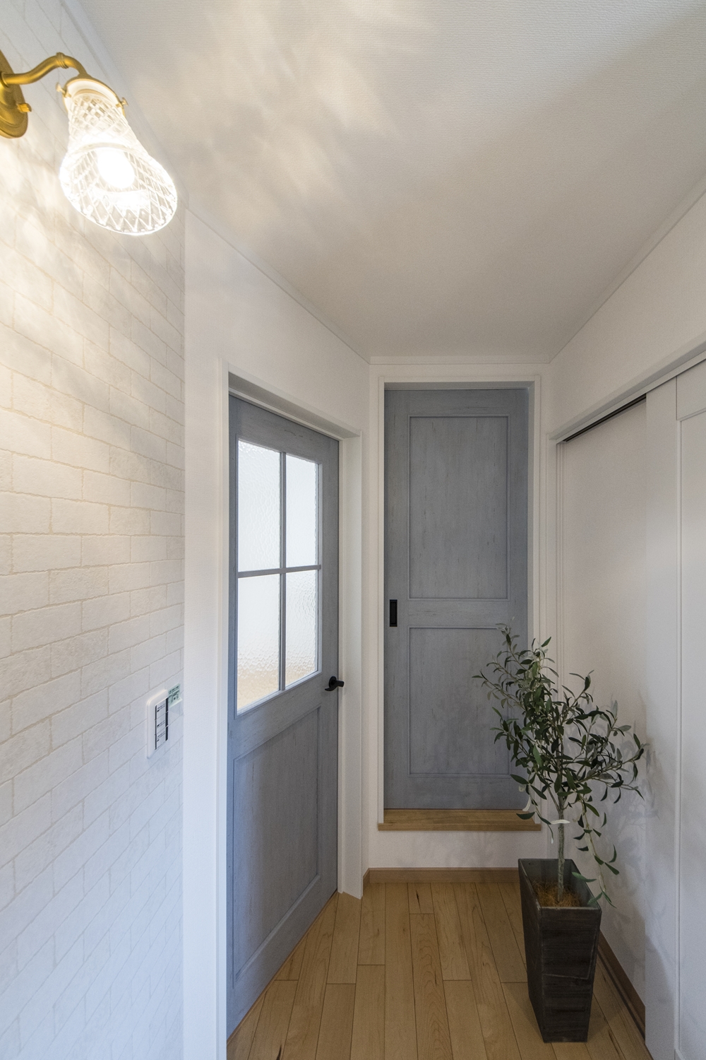 シャビー感のあるレンガ調クロスや、色鮮やかなブルーのドアがアクセントになってオシャレな空間を演出します。