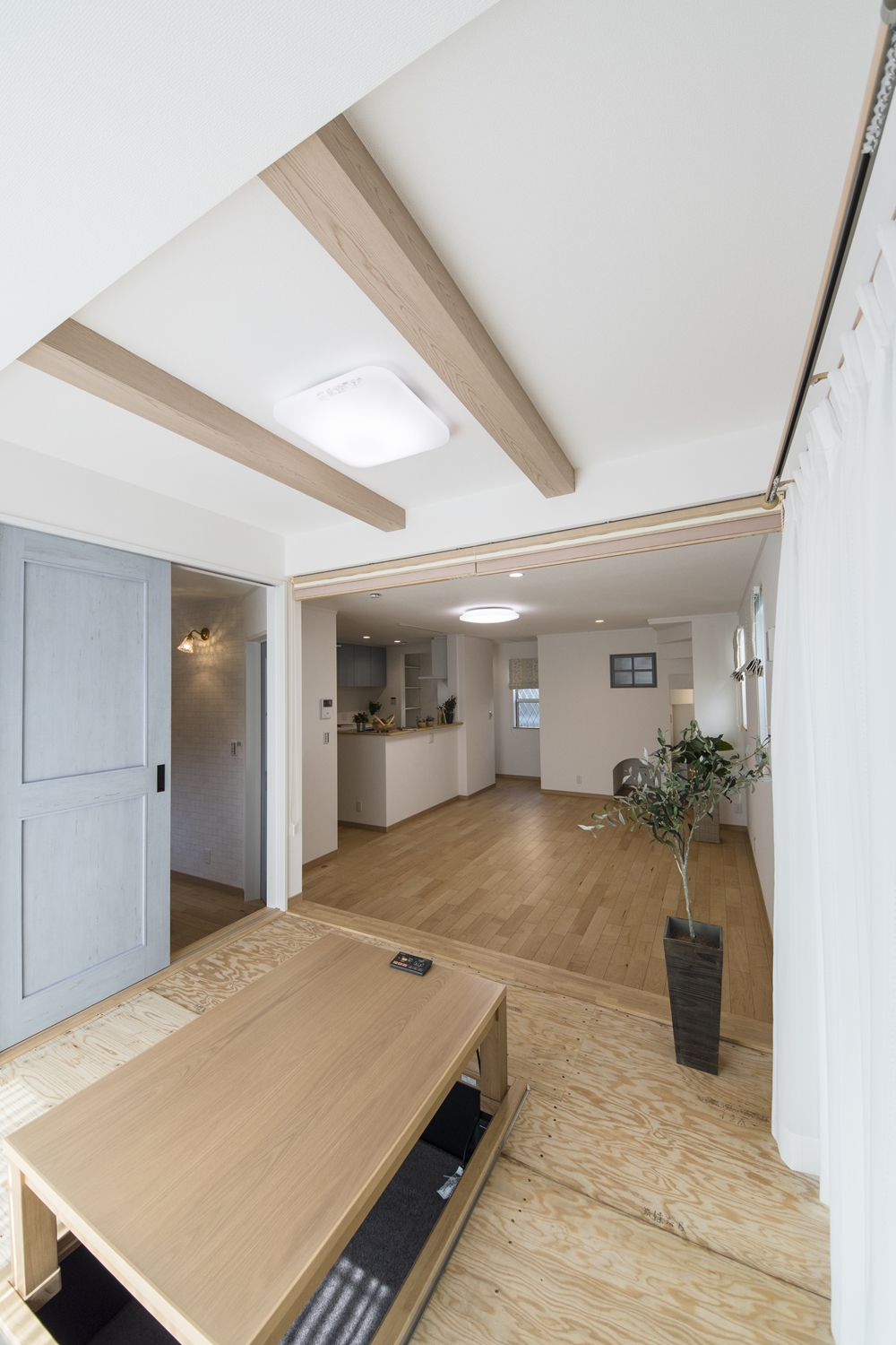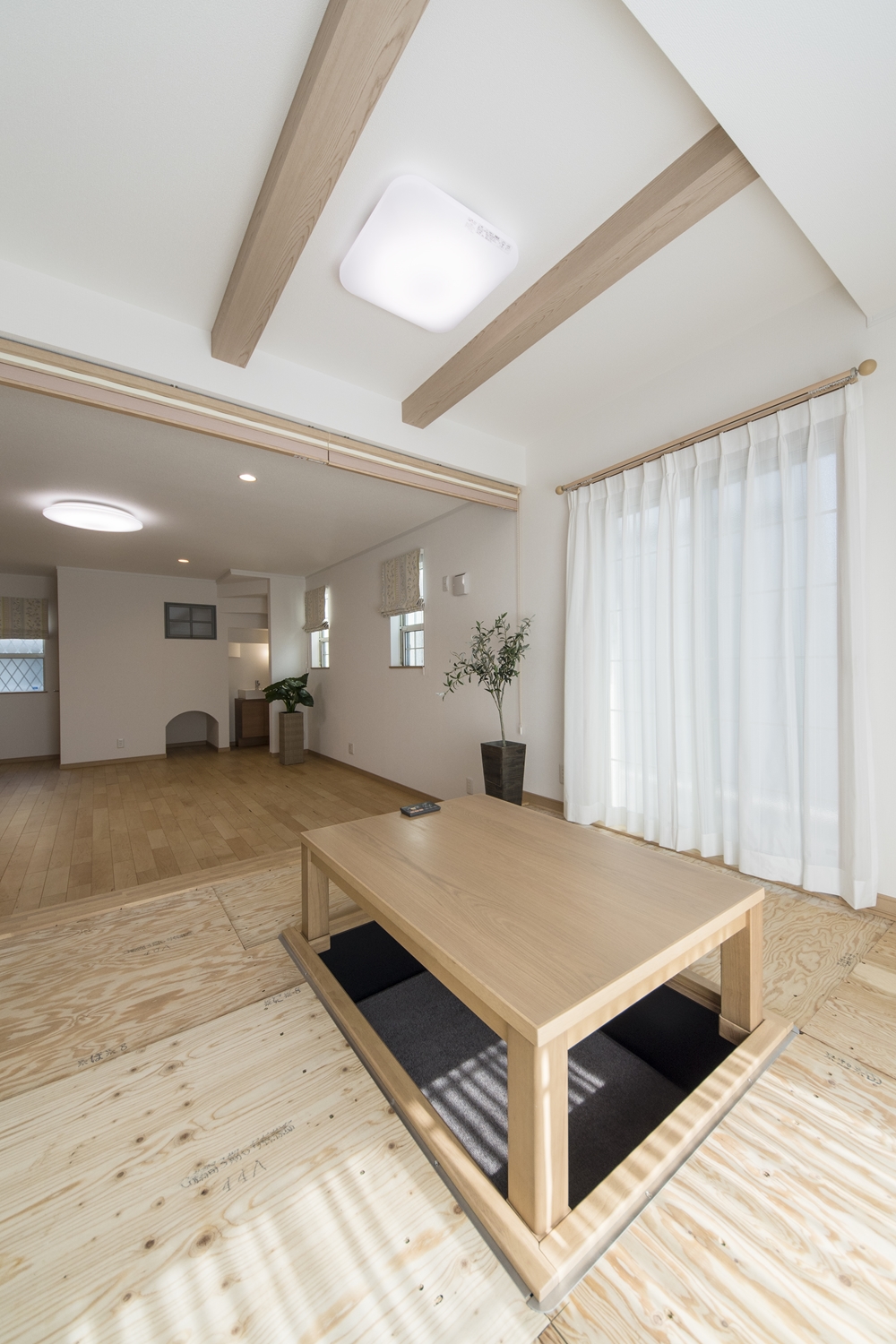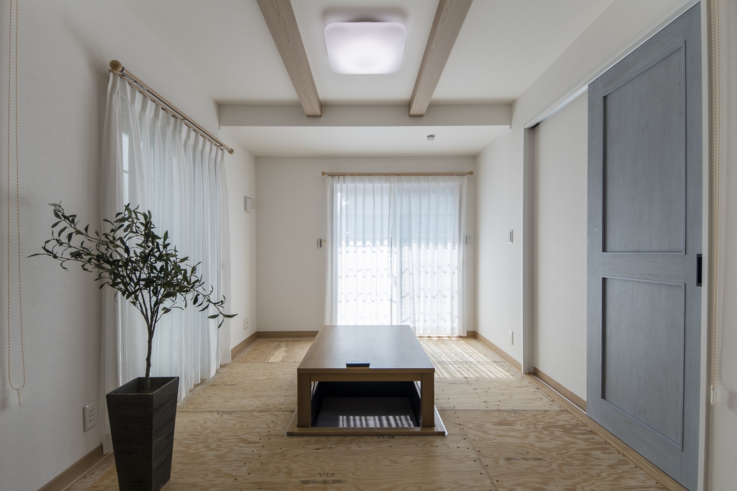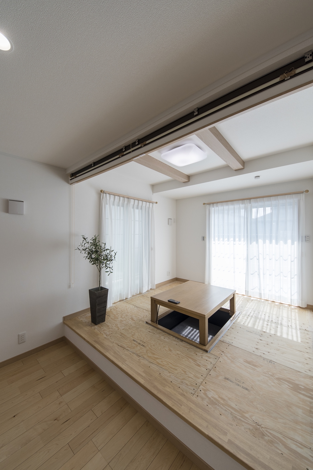 小上がりになった畳スペース(写真は畳設置前)/折り上げ天井に化粧梁をアクセントにした、和洋モダンスタイル。