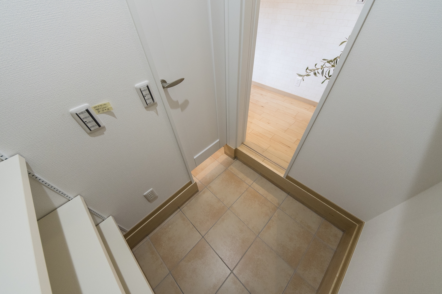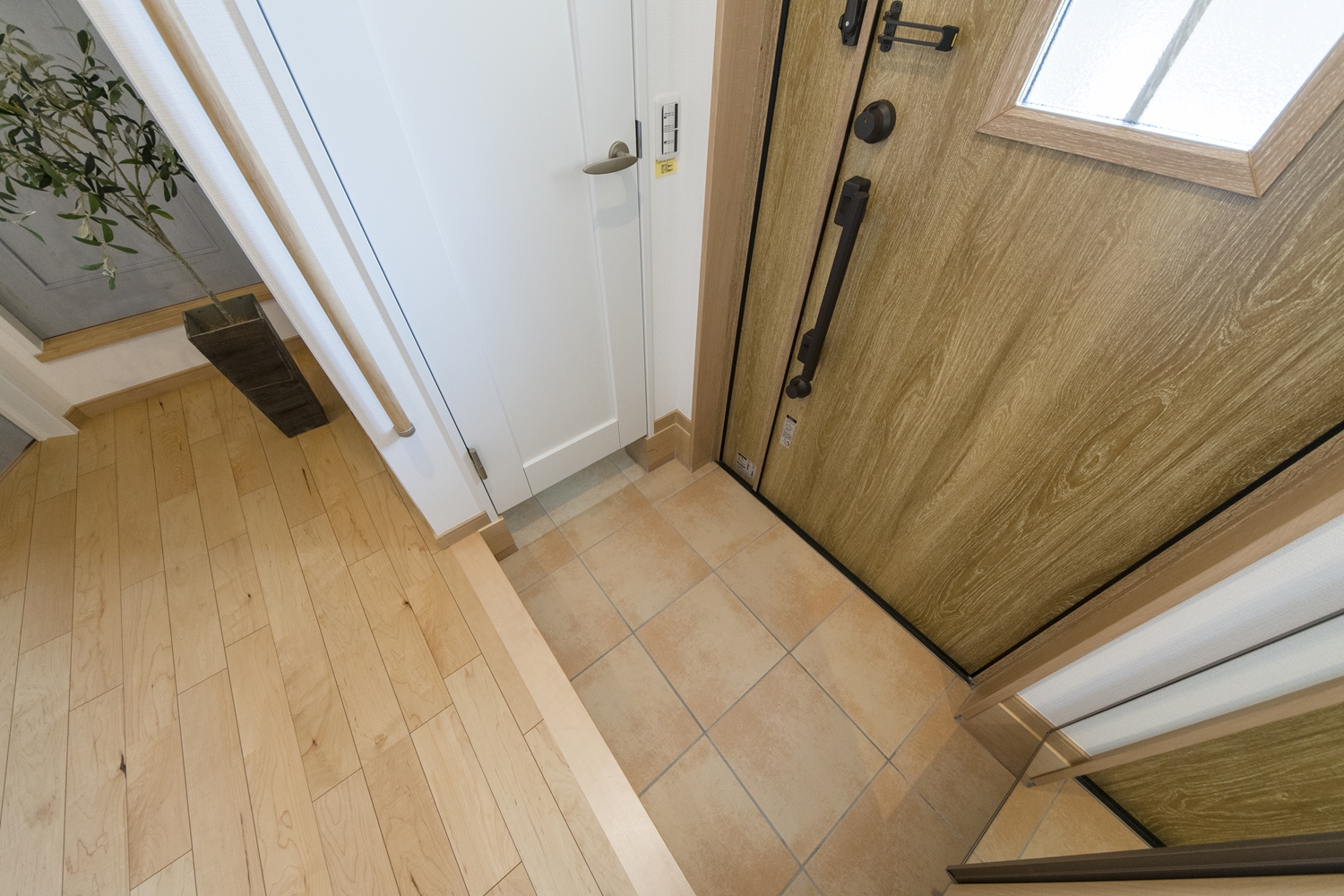 木の温もり感じる玄関ドアと収納、ベージュのテラコッタ調タイルが穏やかな空間を演出。
