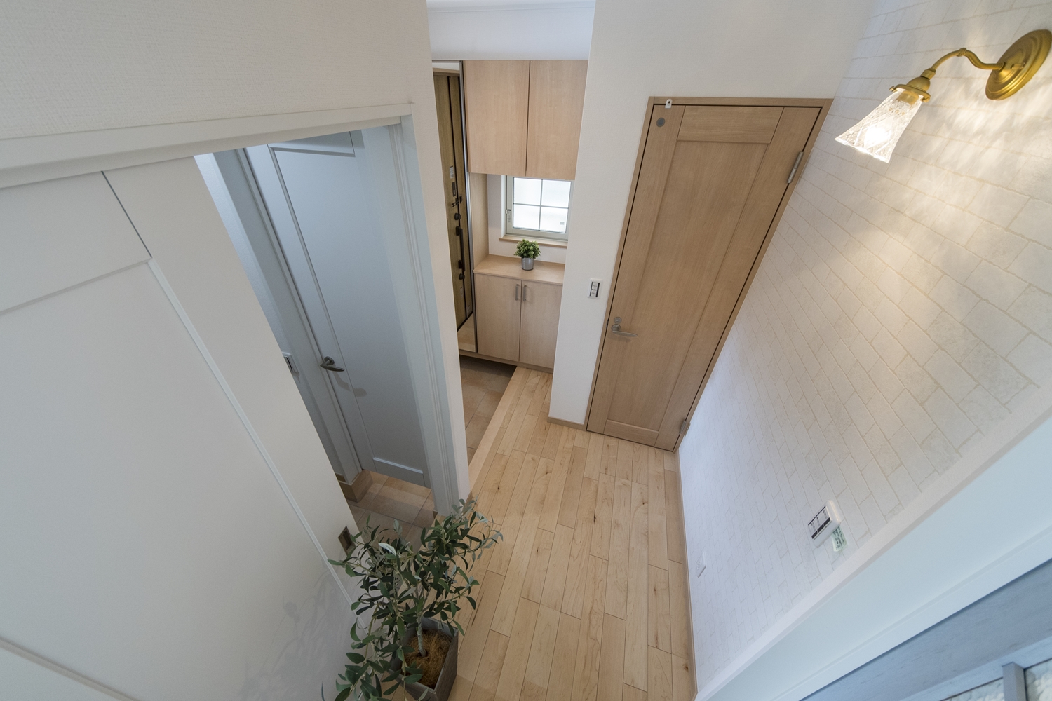木の温もり感じる暖かみのある玄関ホール。繊細なカッティングが美しいガラスの照明が空間を彩ります。