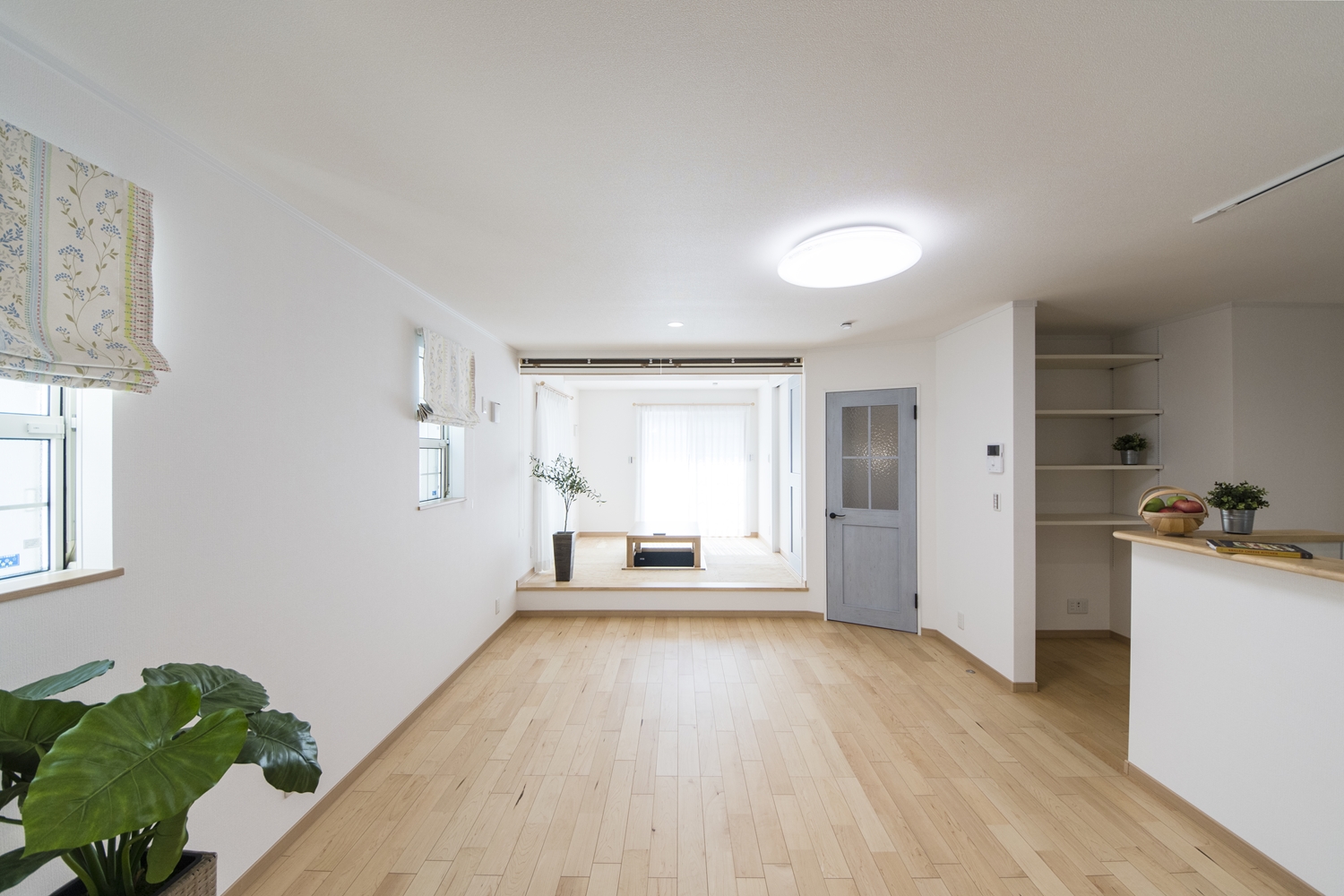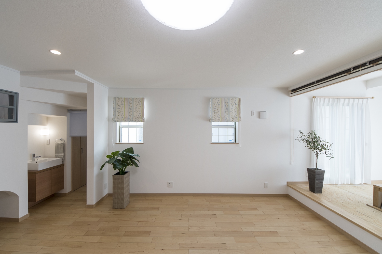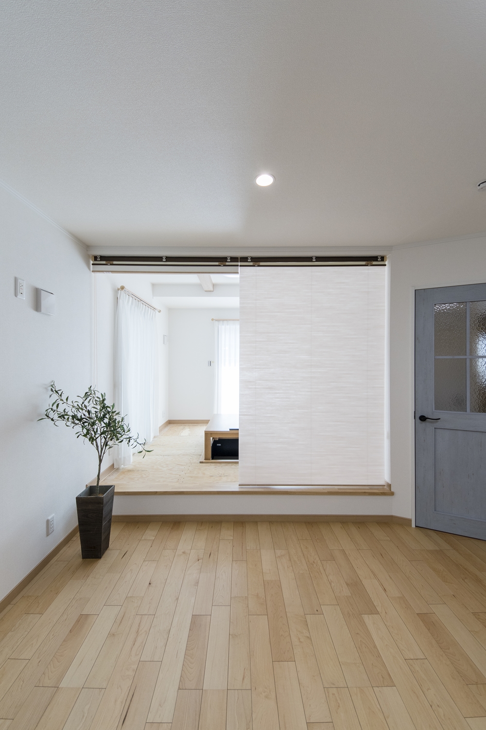 小上がりになった畳スペース(写真は畳設置前)/ロールスクリーンで仕切る事が可能です。