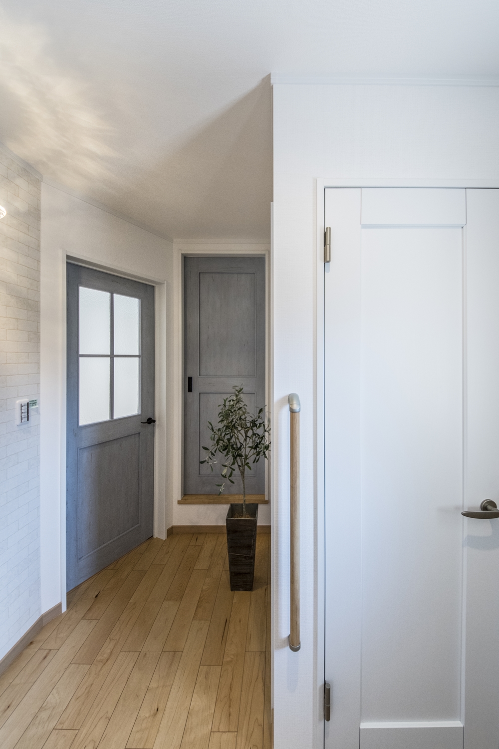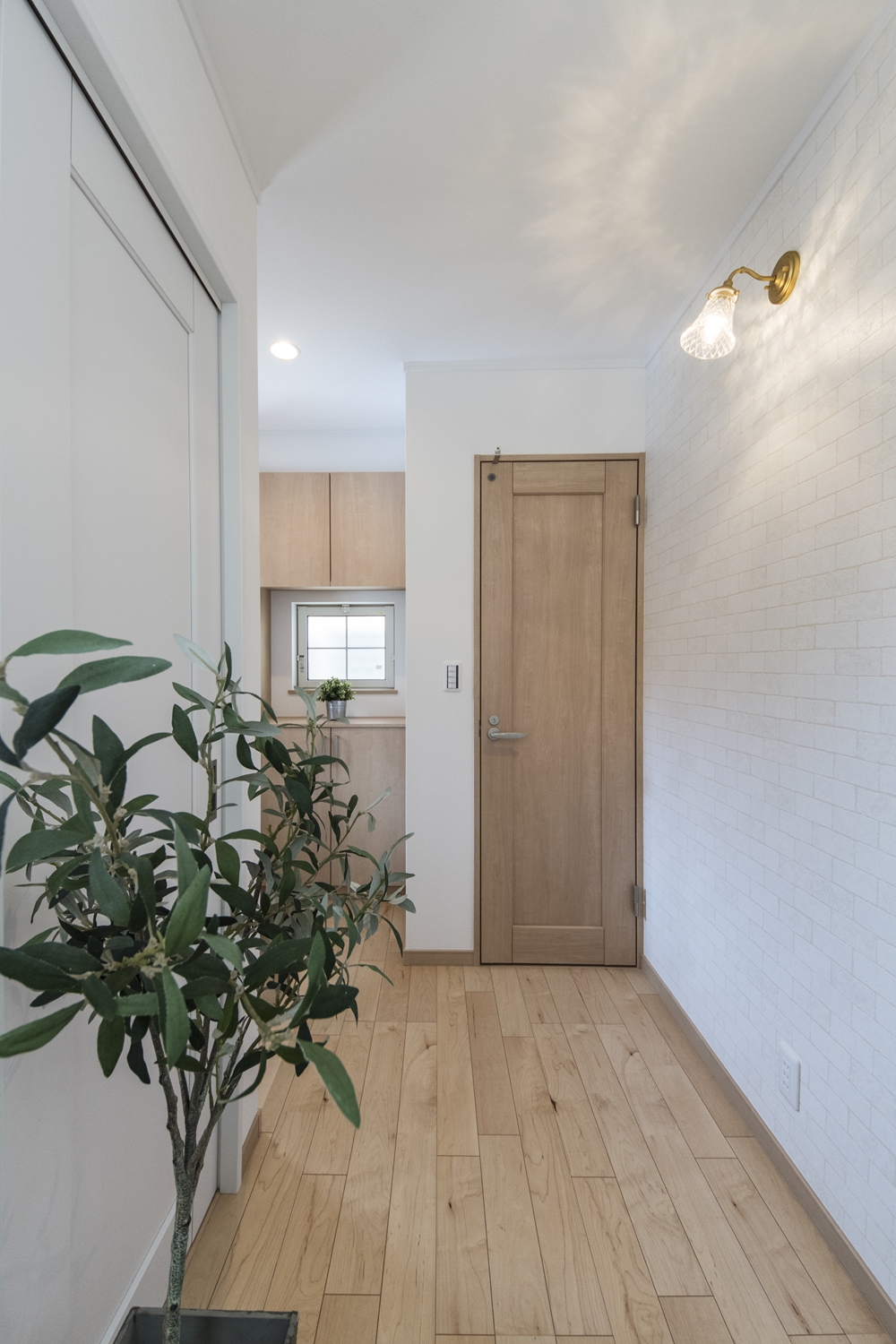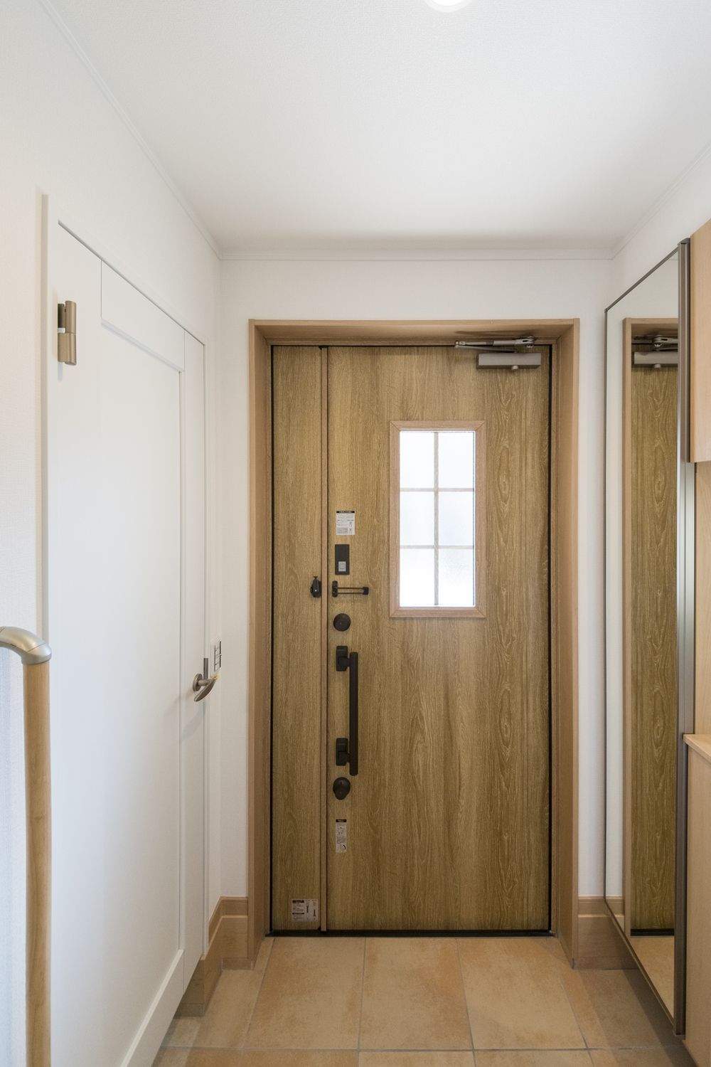 木の温もり感じるナチュラルテイストな玄関。ドアのガラス部分からたっぷりと光が差し込む明るい空間。