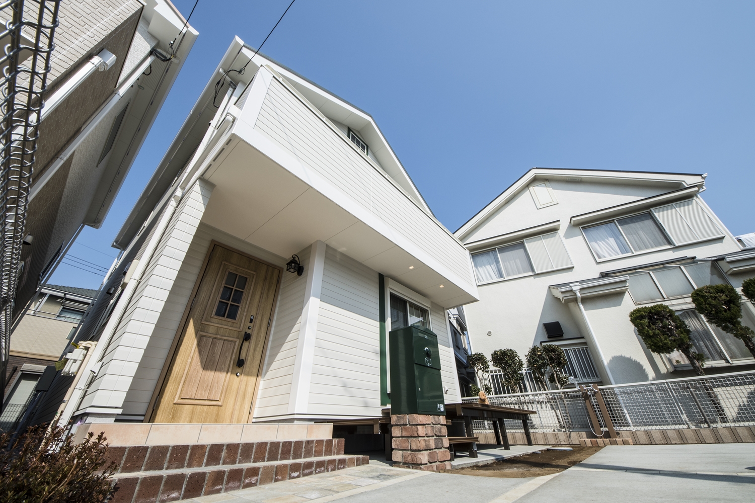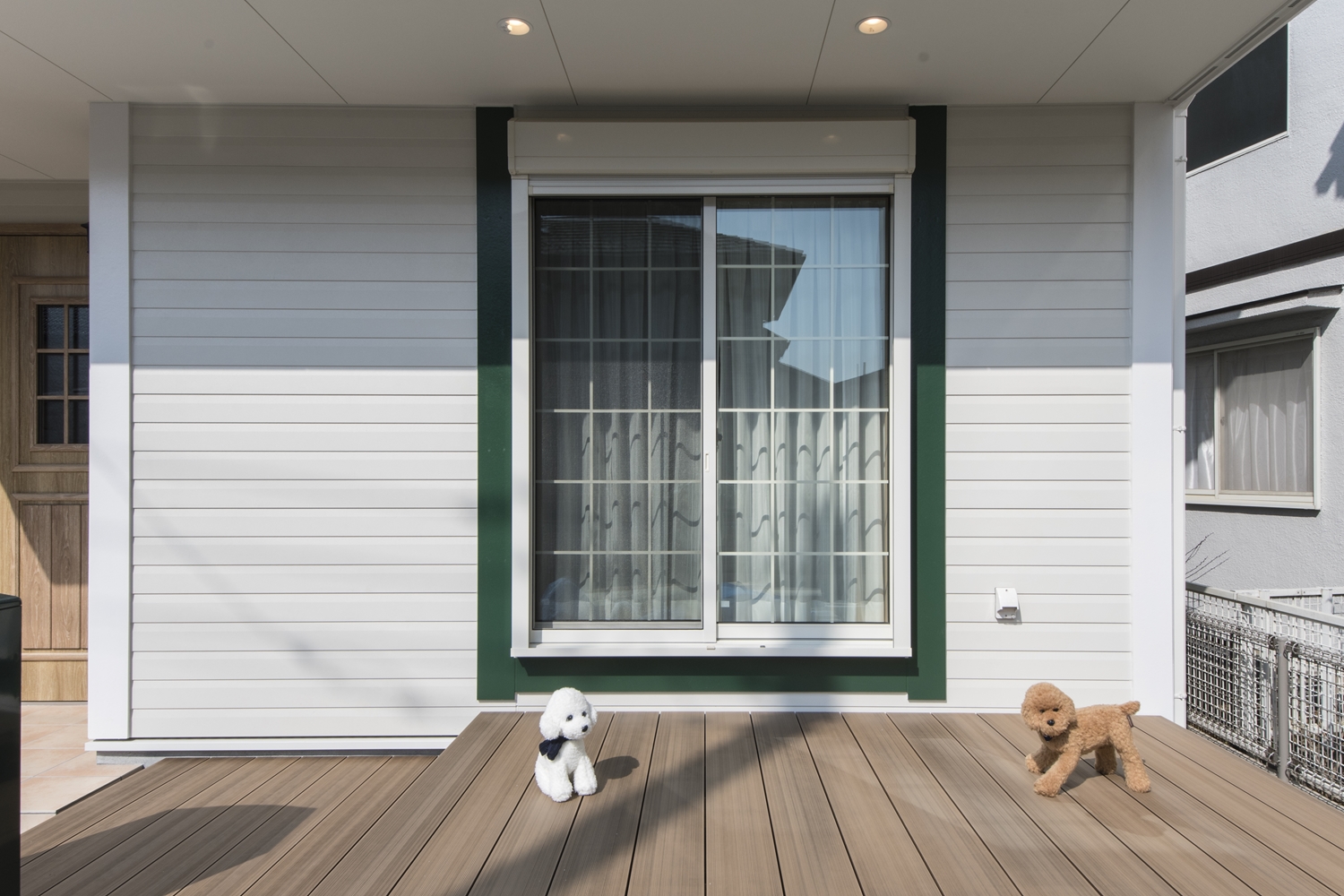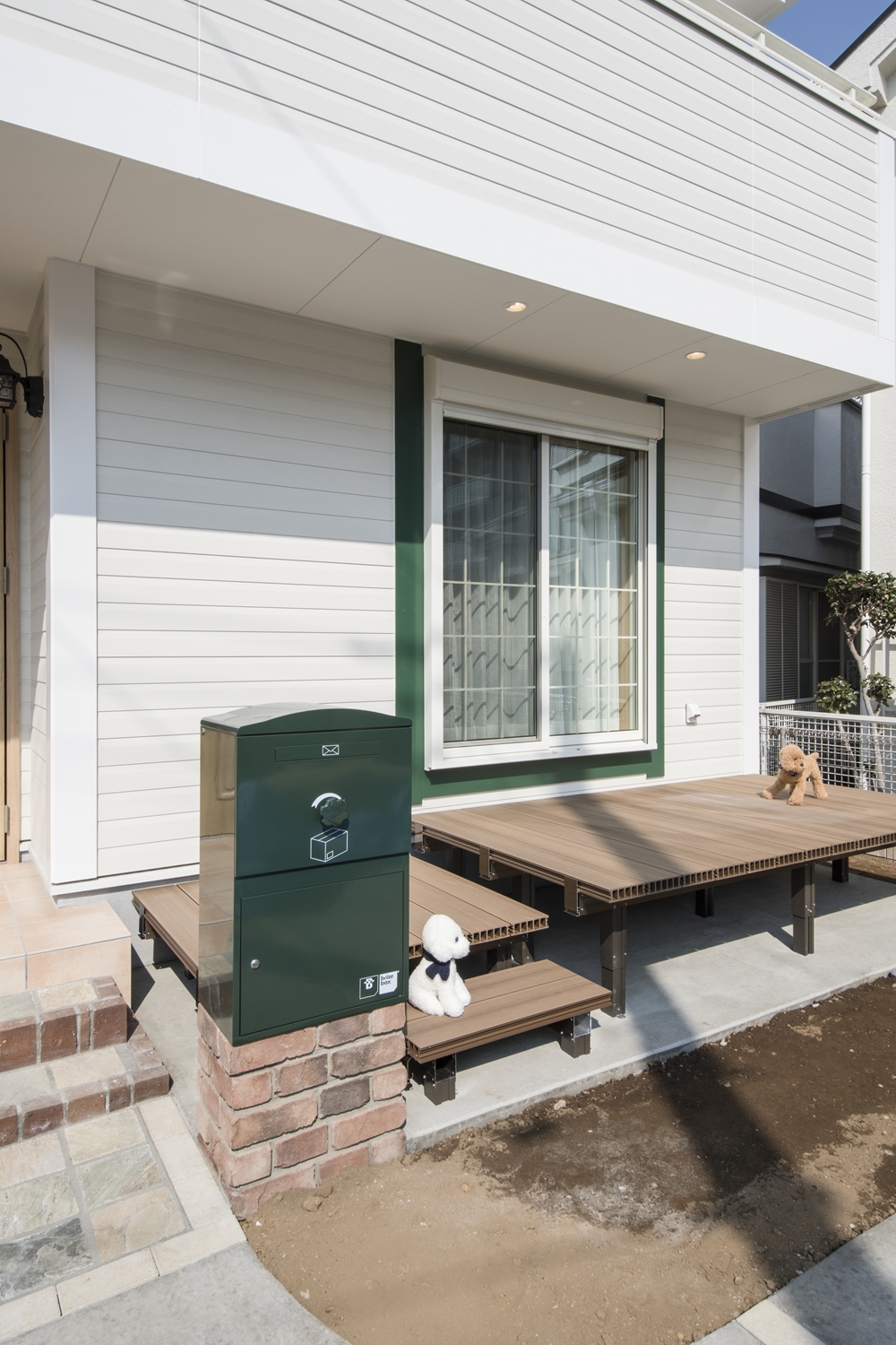 白い外壁に、グリーンの窓モールやポストをアクセントにして、ウッドデッキと木目調の玄関ドアでナチュラルさをプラスした素敵な外観。