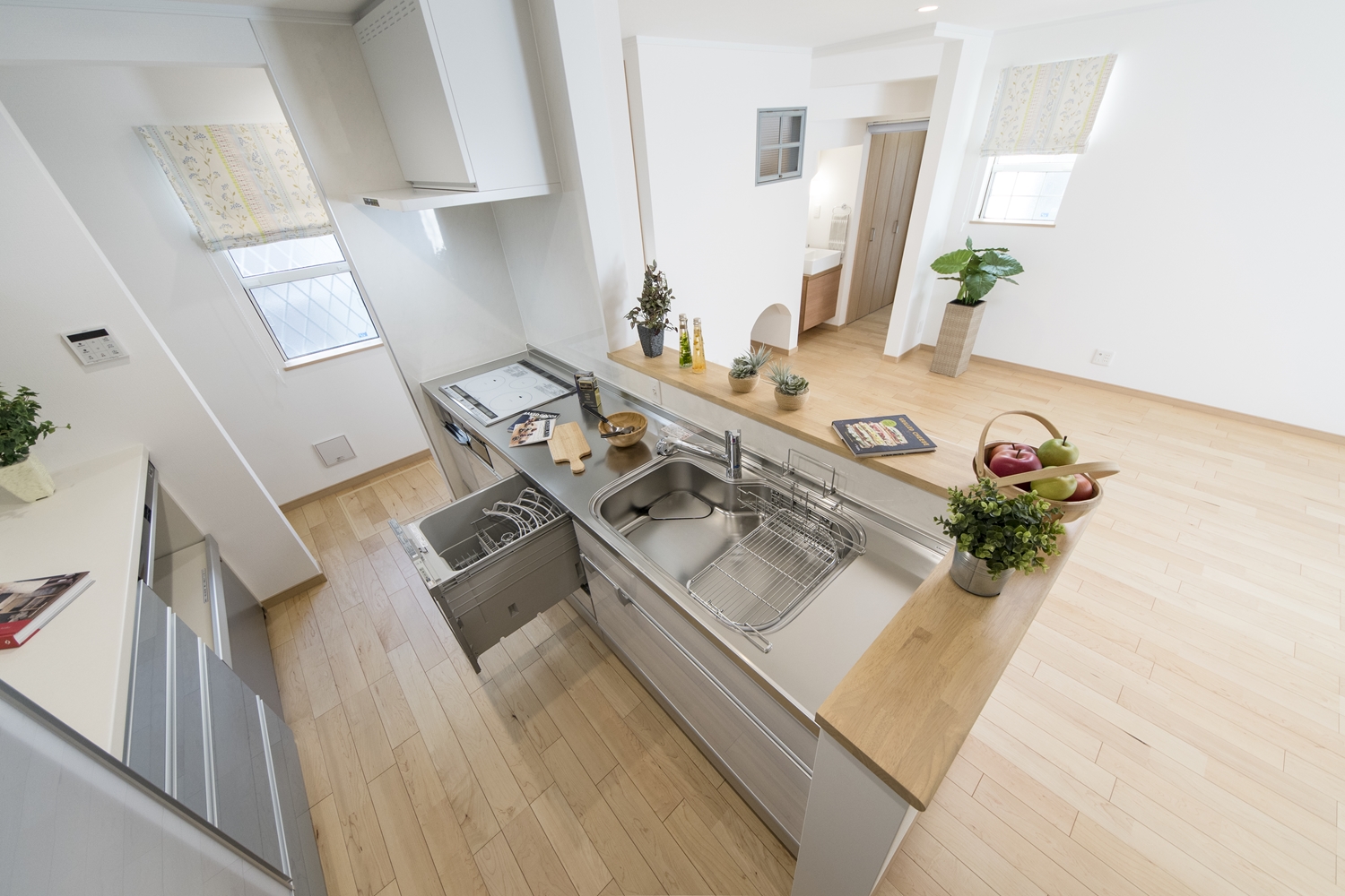 食器洗い乾燥機やカップボードを施し機能美も優れた、家族を見守りながら家事がこなせるカウンター付キッチン。