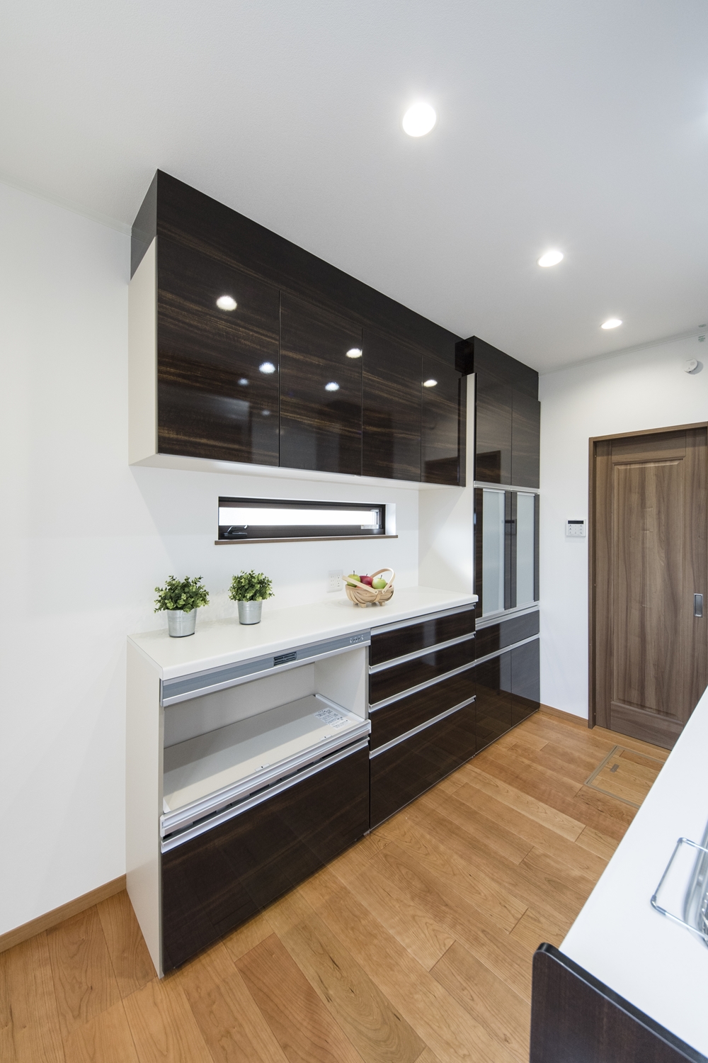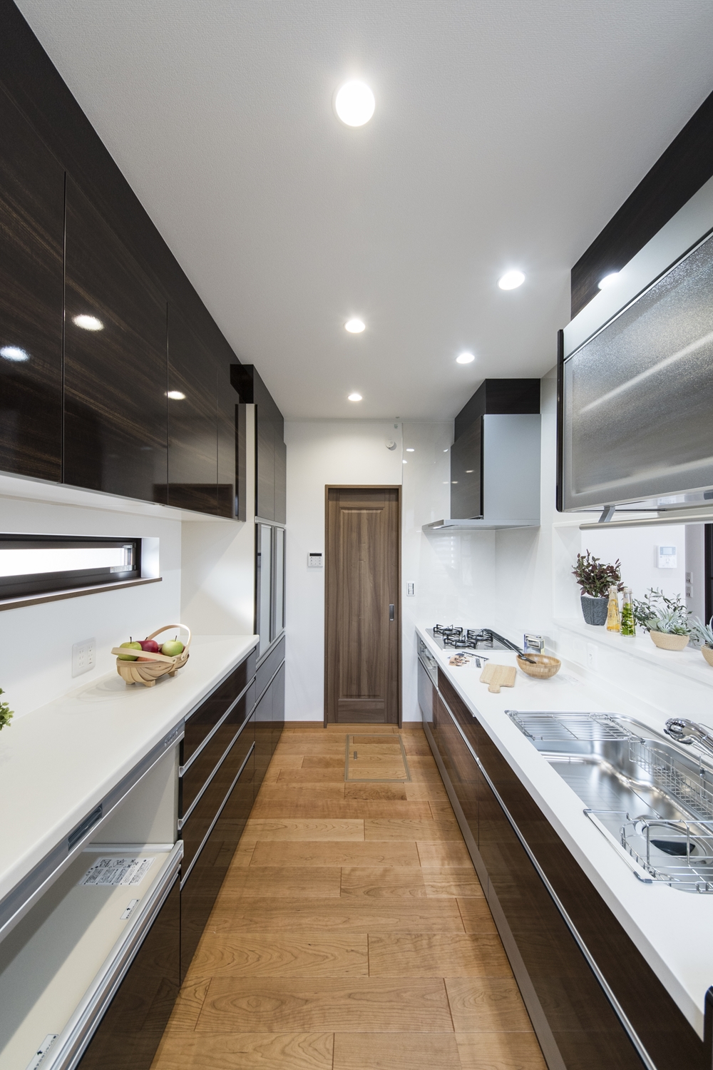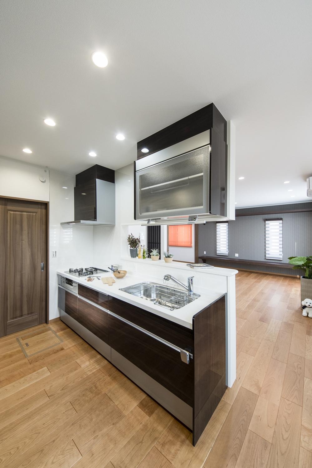 1Fキッチン(親世帯)/ダークブラウンのキッチン扉は、美しい光沢を放つ上品な木目デザインです。