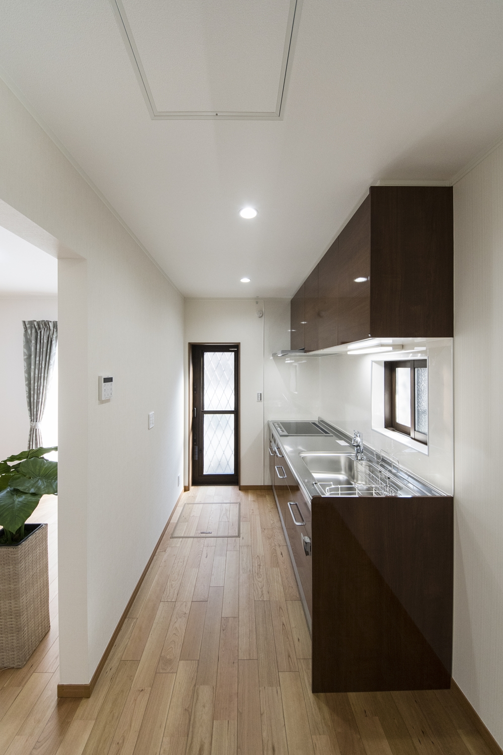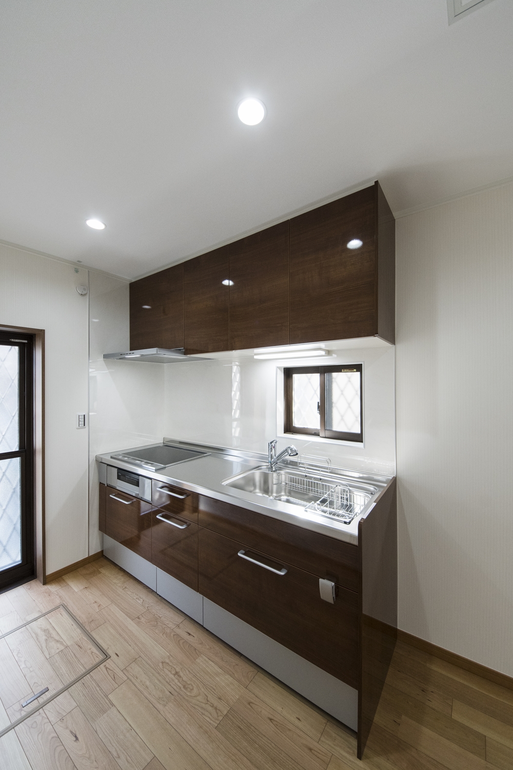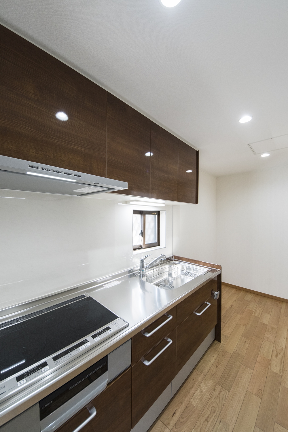 1Fキッチン(親世帯)/ダークブラウンのキッチン扉は、美しい光沢を放つ上品な木目デザインです。