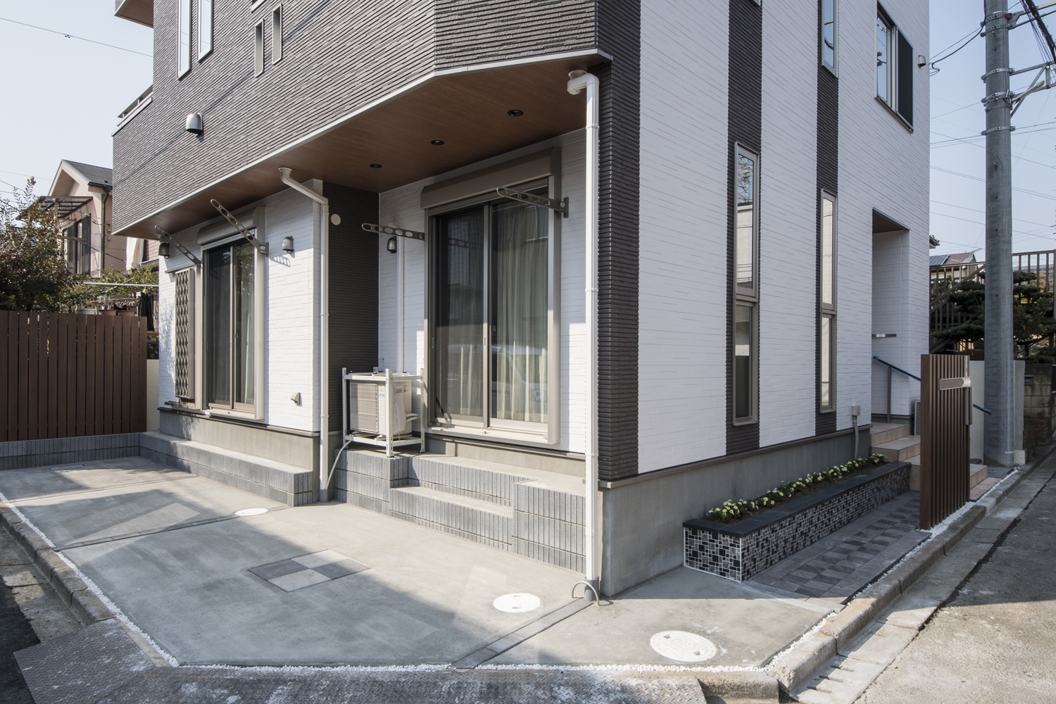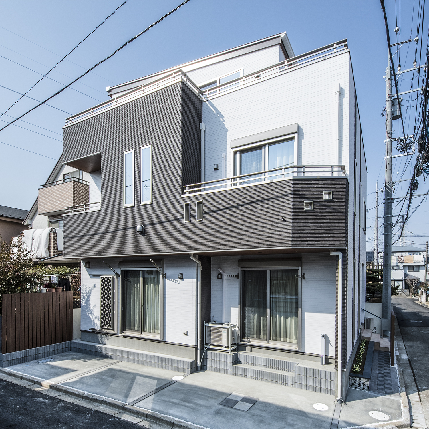 白いサイディングを基調にブラウンのサイディングをアクセントにしたスタイリッシュなデザイン。