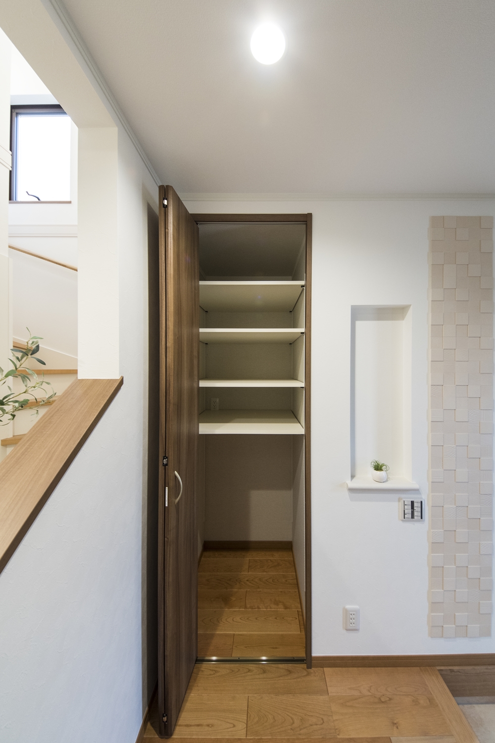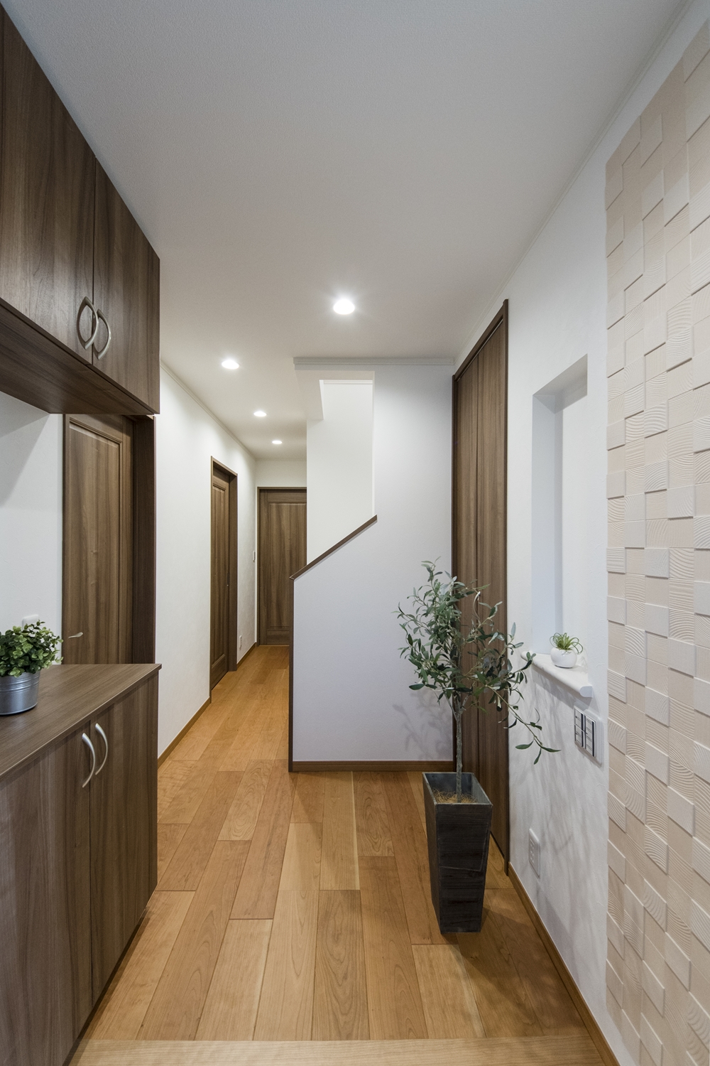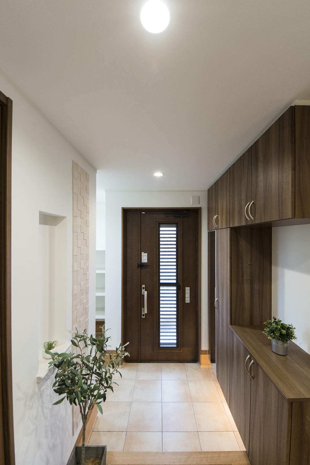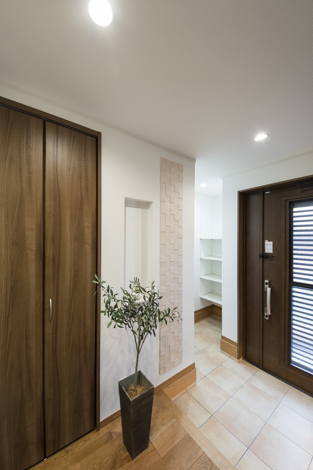 木の温もり感じるナチュラルな配色の二世帯兼用玄関ホール。小物などをおしゃれにディスプレイできるニッチカウンターを設置しました。