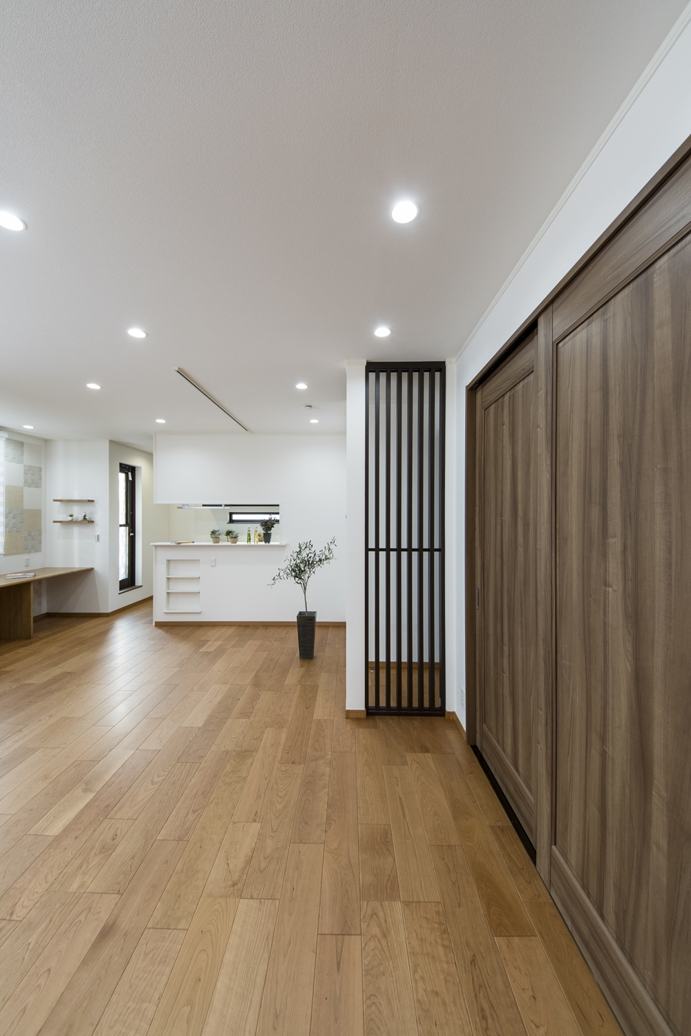 2Fリビング(子世帯)/空間をゆるやかに仕切るスリット格子。シャープでモダンな雰囲気を演出します。