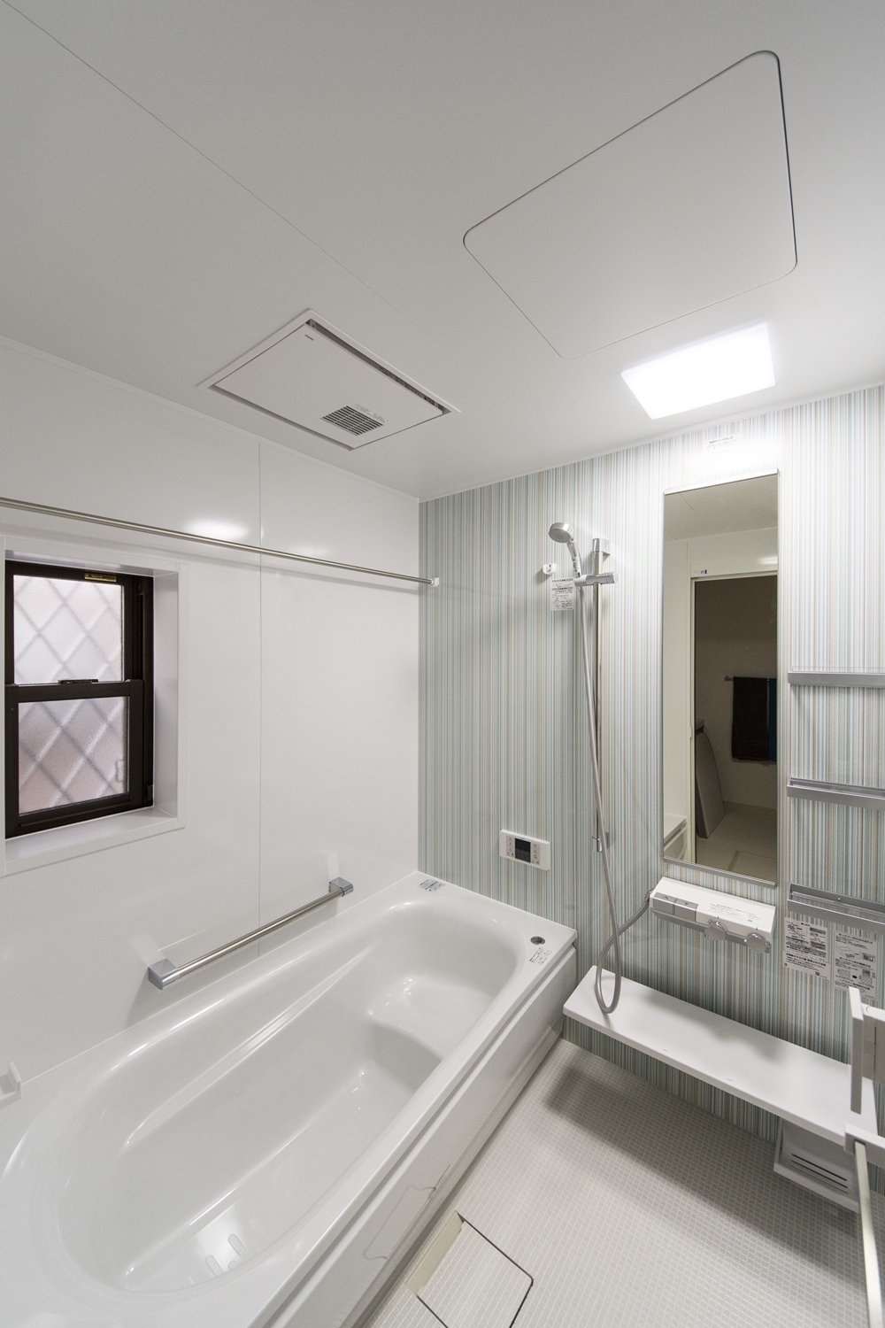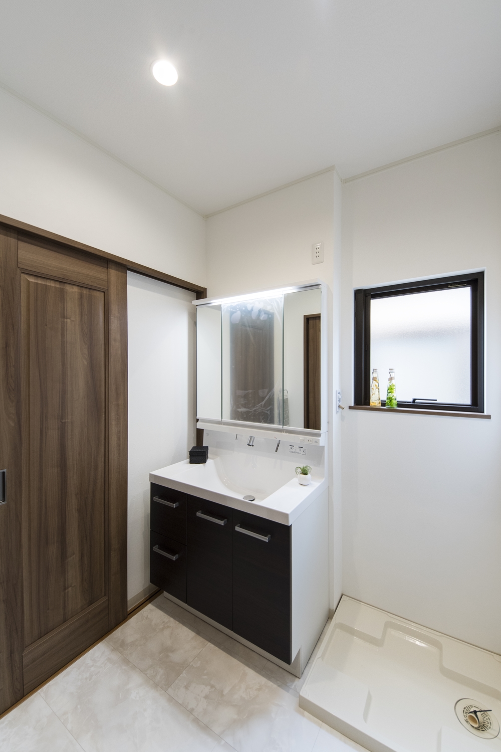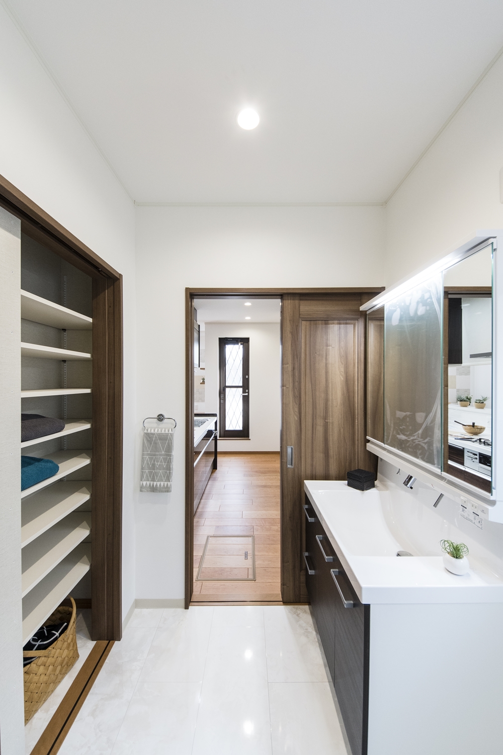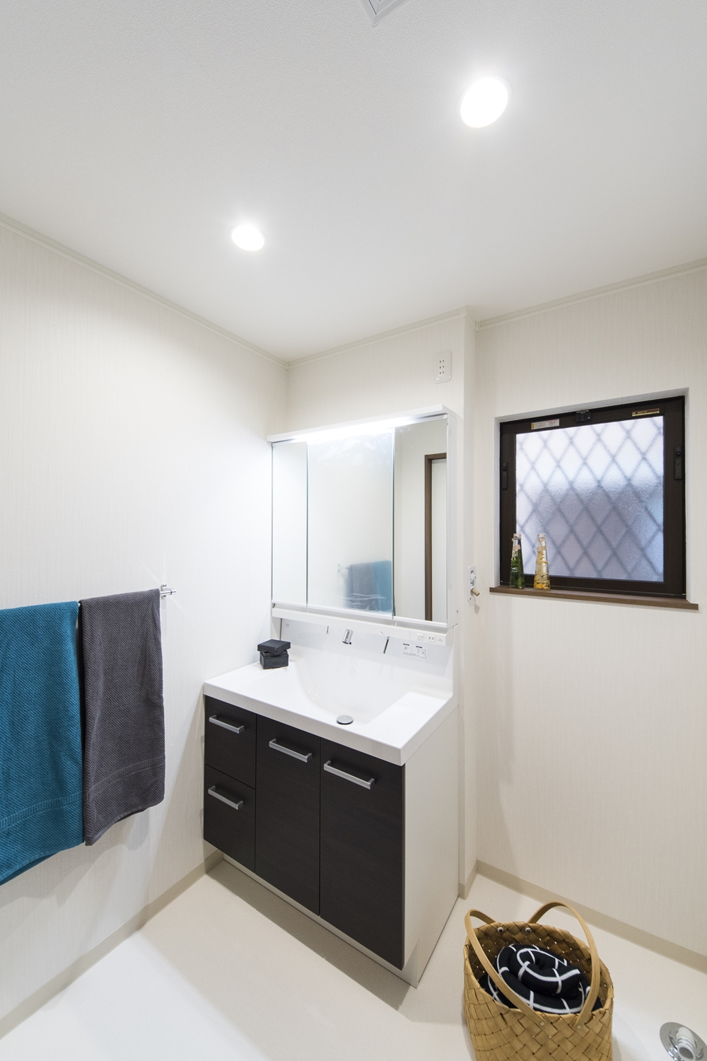 1F(親世帯)/白を基調とした清潔感のあるサニタリールーム。洗面化粧台扉カラーをダークブラウンでアクセントにしました。