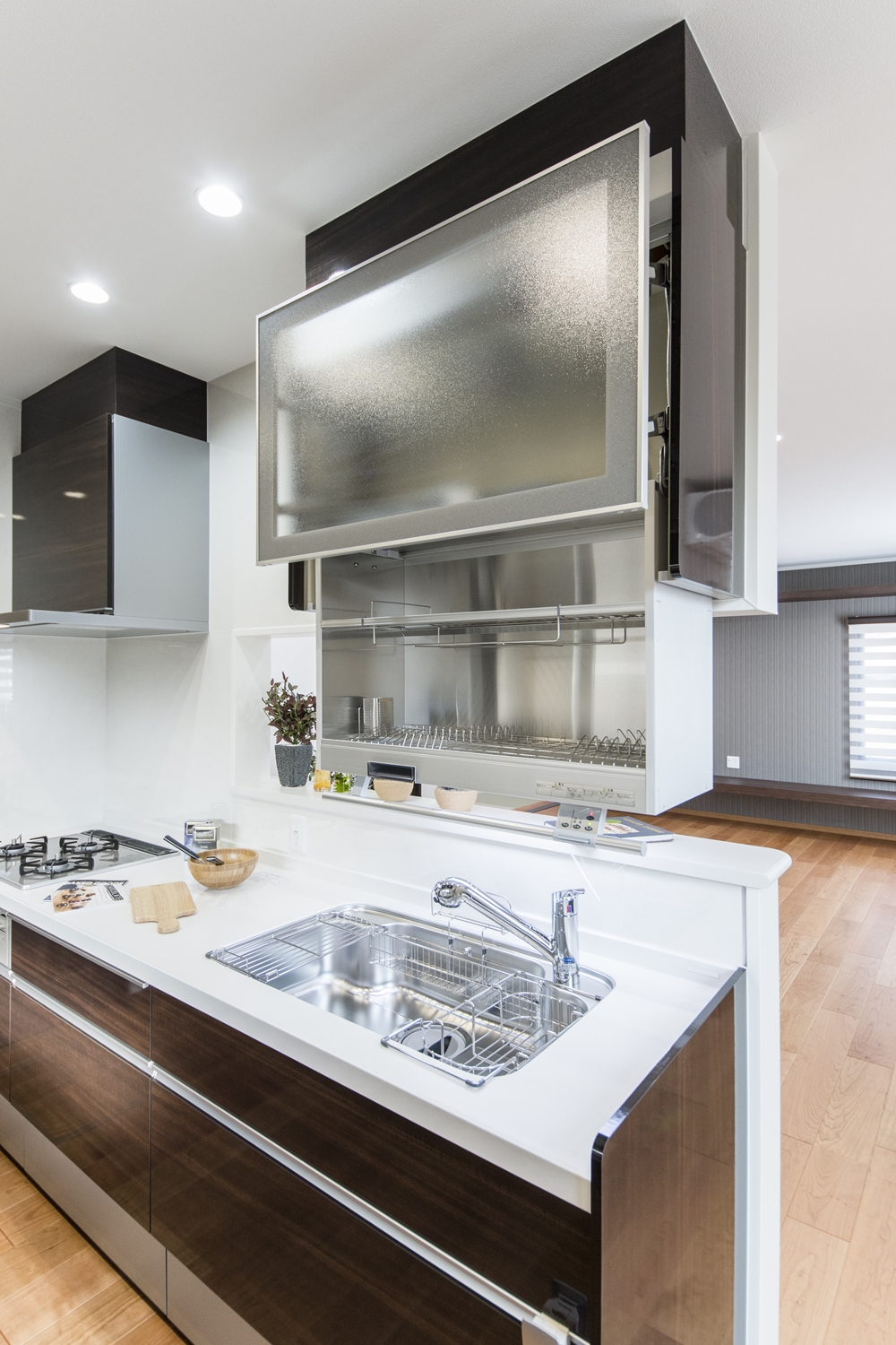2Fキッチン(子世帯)/スイッチ操作で棚が自動的に昇降する、食器乾燥庫を設置しました。ごちゃごちゃ見える水切りかごを無くすことができ、キッチンがスッキリ見えます♪